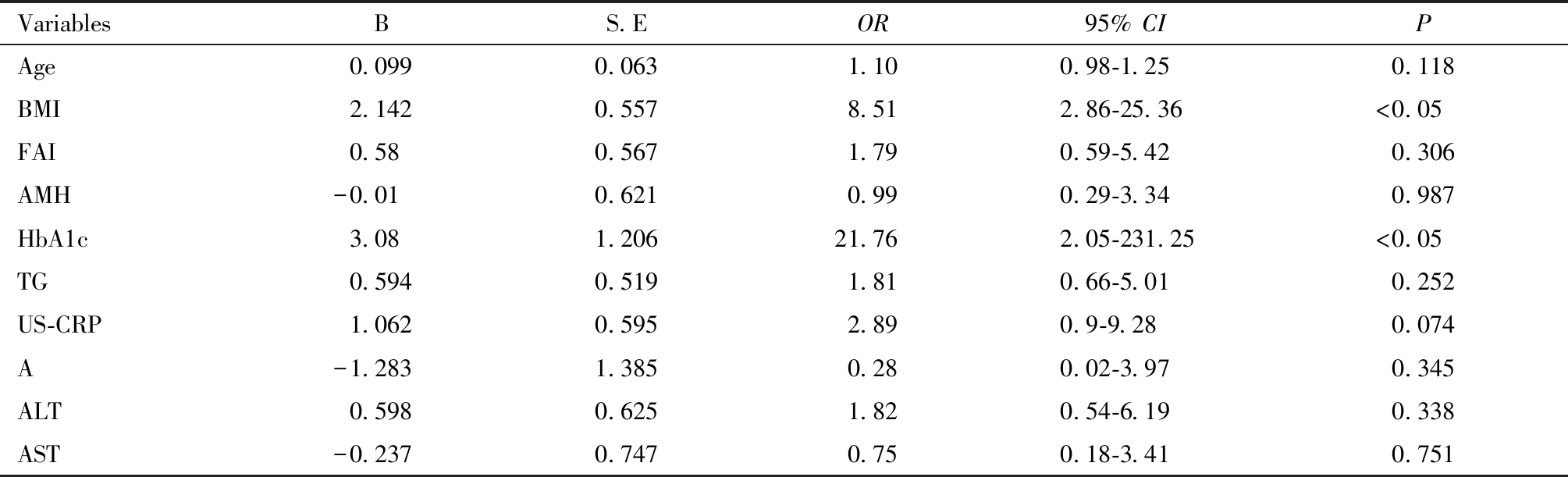 VariablesBS.EOR95% CI PAge0.0990.0631.100.98-1.250.118BMI2.1420.5578.512.86-25.36<0.05FAI0.580.5671.790.59-5.420.306AMH-0.010.6210.990.29-3.340.987HbA1c3.081.20621.762.05-231.25<0.05TG0.5940.5191.810.66-5.010.252US-CRP1.0620.5952.890.9-9.280.074A-1.2831.3850.280.02-3.970.345ALT0.5980.6251.820.54-6.190.338AST-0.2370.7470.750.18-3.410.751