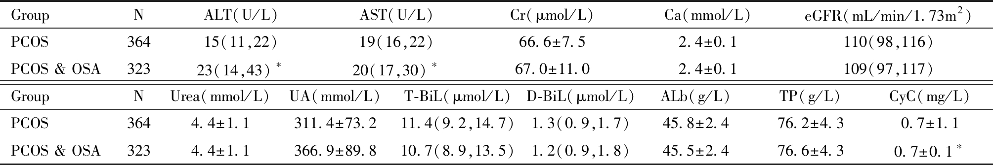 GroupNALT(U/L)AST(U/L)Cr(μmol/L)Ca(mmol/L)eGFR(mL/min/1.73m2)PCOS36415(11,22)19(16,22)66.6±7.52.4±0.1110(98,116)PCOS & OSA32323(14,43)∗20(17,30) ∗67.0±11.02.4±0.1109(97,117)GroupNUrea(mmol/L)UA(mmol/L)T-BiL(μmol/L)D-BiL(μmol/L)ALb(g/L)TP(g/L)CyC(mg/L)PCOS3644.4±1.1311.4±73.211.4(9.2,14.7)1.3(0.9,1.7)45.8±2.476.2±4.30.7±1.1PCOS & OSA3234.4±1.1366.9±89.810.7(8.9,13.5)1.2(0.9,1.8)45.5±2.476.6±4.30.7±0.1∗