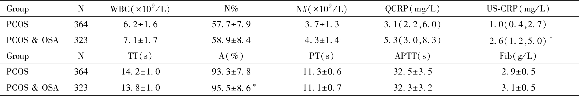 GroupNWBC(×109/L)N%N#(×109/L)QCRP(mg/L)US-CRP(mg/L)PCOS3646.2±1.657.7±7.93.7±1.33.1(2.2,6.0)1.0(0.4,2.7)PCOS & OSA3237.1±1.758.9±8.44.3±1.45.3(3.0,8.3)2.6(1.2,5.0) ∗GroupNTT(s)A(%)PT(s)APTT(s)Fib(g/L)PCOS36414.2±1.093.3±7.811.3±0.632.5±3.52.9±0.5PCOS & OSA32313.8±1.095.5±8.6∗11.1±0.732.3±3.23.1±0.5