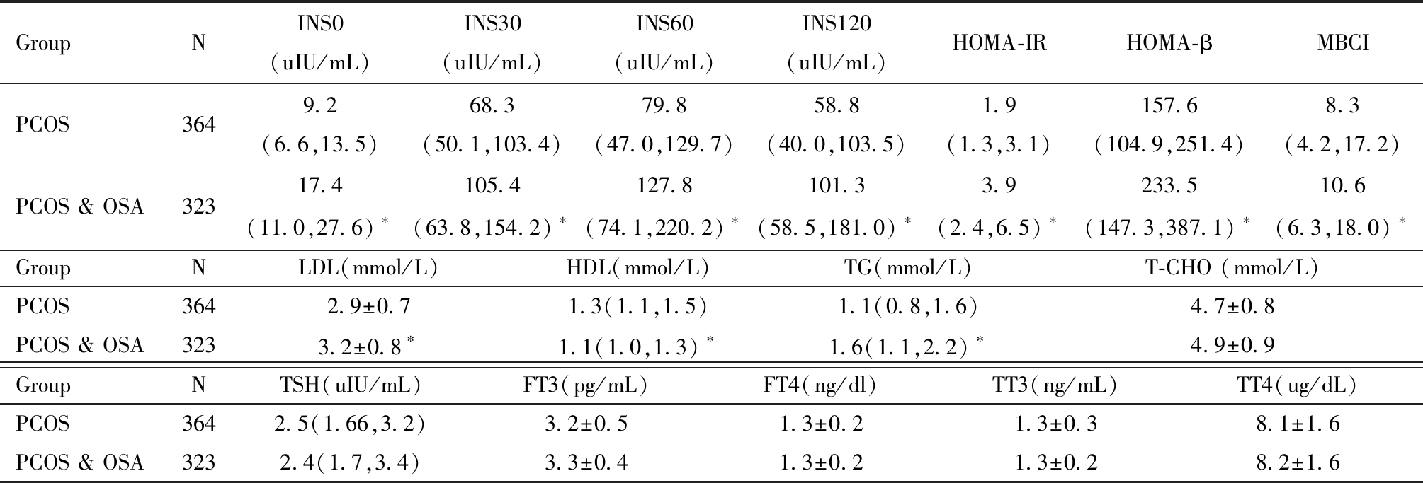 GroupNINS0(uIU/mL)INS30(uIU/mL)INS60(uIU/mL)INS120(uIU/mL)HOMA-IRHOMA-βMBCIPCOS3649.2(6.6,13.5)68.3(50.1,103.4)79.8(47.0,129.7)58.8(40.0,103.5)1.9(1.3,3.1)157.6(104.9,251.4)8.3(4.2,17.2)PCOS & OSA32317.4(11.0,27.6) ∗105.4(63.8,154.2) ∗127.8(74.1,220.2) ∗101.3(58.5,181.0) ∗3.9(2.4,6.5) ∗233.5(147.3,387.1) ∗10.6(6.3,18.0) ∗GroupNLDL(mmol/L)HDL(mmol/L)TG(mmol/L)T-CHO (mmol/L)PCOS3642.9±0.71.3(1.1,1.5)1.1(0.8,1.6)4.7±0.8PCOS & OSA3233.2±0.8∗1.1(1.0,1.3) ∗1.6(1.1,2.2) ∗4.9±0.9GroupNTSH(uIU/mL)FT3(pg/mL)FT4(ng/dl)TT3(ng/mL)TT4(ug/dL)PCOS3642.5(1.66,3.2)3.2±0.51.3±0.21.3±0.38.1±1.6PCOS & OSA3232.4(1.7,3.4)3.3±0.41.3±0.21.3±0.28.2±1.6