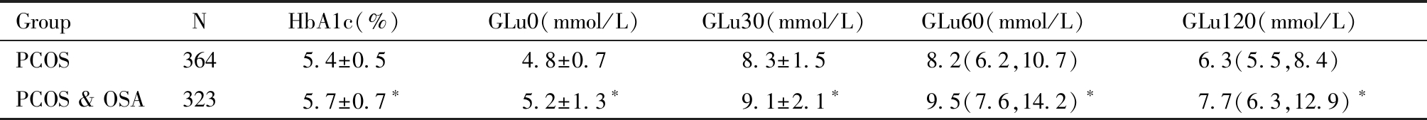 GroupNHbA1c(%)GLu0(mmol/L)GLu30(mmol/L)GLu60(mmol/L)GLu120(mmol/L)PCOS3645.4±0.54.8±0.78.3±1.58.2(6.2,10.7)6.3(5.5,8.4)PCOS & OSA3235.7±0.7∗5.2±1.3∗9.1±2.1∗9.5(7.6,14.2) ∗7.7(6.3,12.9)∗