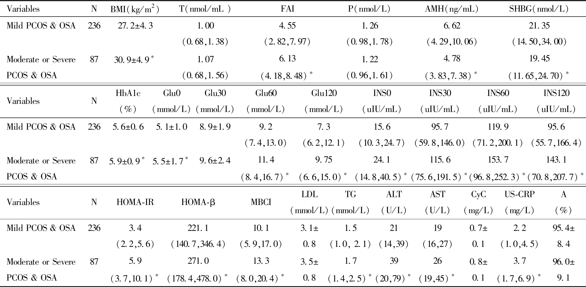 VariablesNBMI(kg/m2)T(nmol/mL )FAIP(nmol/L)AMH(ng/mL)SHBG(nmol/L)Mild PCOS & OSA23627.2±4.31.00(0.68,1.38)4.55(2.82,7.97)1.26(0.98,1.78)6.62(4.29,10.06)21.35(14.50,34.00)Moderate or Severe PCOS & OSA8730.9±4.9∗1.07(0.68,1.56)6.13(4.18,8.48)∗1.22(0.96,1.61)4.78(3.83,7.38)∗19.45(11.65,24.70)∗VariablesNHbA1c(%)Glu0(mmol/L)Glu30(mmol/L)Glu60(mmol/L)Glu120(mmol/L)INS0(uIU/mL)INS30(uIU/mL)INS60(uIU/mL)INS120(uIU/mL)Mild PCOS & OSA2365.6±0.65.1±1.08.9±1.99.2(7.4,13.0)7.3(6.2,12.1)15.6(10.3,24.7)95.7(59.8,146.0)119.9(71.2,200.1)95.6(55.7,166.4)Moderate or Severe PCOS & OSA875.9±0.9∗5.5±1.7∗9.6±2.411.4(8.4,16.7) ∗9.75(6.6,15.0) ∗24.1(14.8,40.5) ∗115.6(75.6,191.5) ∗153.7(96.8,252.3)∗143.1(70.8,207.7)∗VariablesNHOMA-IRHOMA-βMBCILDL(mmol/L)TG(mmol/L)ALT(U/L)AST(U/L)CyC(mg/L)US-CRP(mg/L)A(%)Mild PCOS & OSA2363.4(2.2,5.6)221.1(140.7,346.4)10.1(5.9,17.0)3.1±0.81.5(1.0, 2.1)21(14,39)19(16,27)0.7±0.12.2(1.0,4.5)95.4±8.4Moderate or Severe PCOS & OSA875.9(3.7,10.1) ∗271.0(178.4,478.0)∗13.3(8.0,20.4) ∗3.5±0.81.7(1.4,2.5) ∗39(20,79)∗26(19,45) ∗0.8±0.13.7(1.7,6.9) ∗96.0±9.1