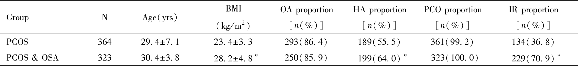 入组患者年龄在19至41岁之间,PCOS &OSA患者与单纯PCOS患者的年龄差异没有统计学意义。在单纯PCOS患者与PCOS &OSA患者临床特征比较中,PCOS &OSA患者的BMI均值为(28.2±4.8)kg/m2,明显高于单纯PCOS组患者均值(23.4±3.3)kg/m2,且差异具有统计学意义;PCOS &OSA患者HA人数占比高于单纯PCOS组患者(P<0.05),PCOS &OSA患者IR人数占比高达70.9%(229/323),显著高于单纯PCOS中IR人数占比[36.8%(134/364)],差异具有统计学意义。本研究中OA人数占比79.0%(543/687),PCO人数占比99.6%(543/687),而单纯PCOS患者与PCOS &OSA患者之间OA人数占比、PCO人数占比差异均没有统计学意义。见表3。