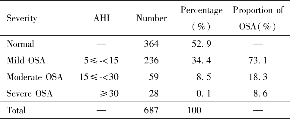 Severity AHINumberPercentage(%)Proportion of OSA(%)Normal—36452.9—Mild OSA5≤-<1523634.473.1Moderate OSA15≤-<30598.518.3Severe OSA≥30280.18.6Total—687100—