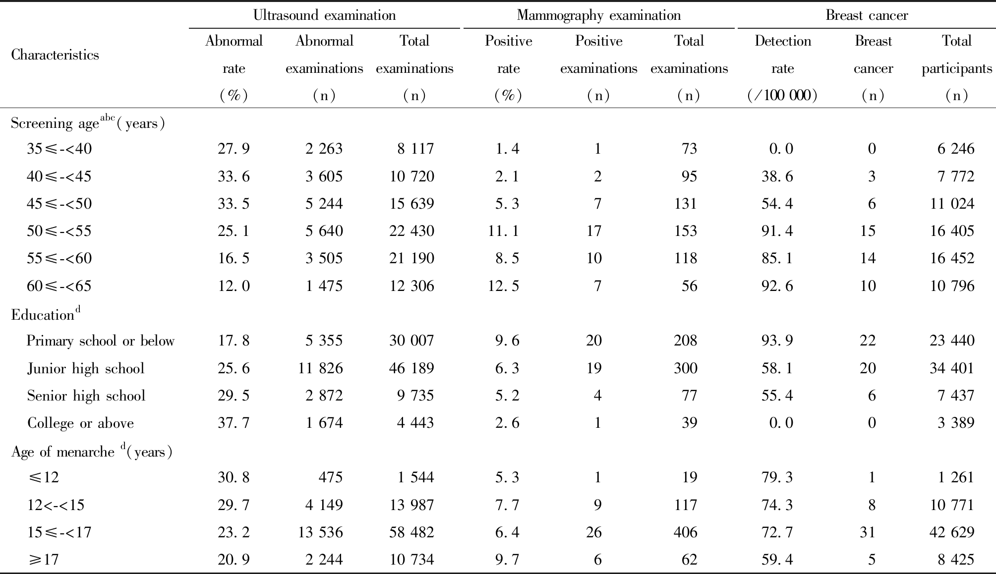 CharacteristicsUltrasound examinationAbnormal rate (%)Abnormal examinations (n)Totalexaminations (n)Mammography examinationPositive rate (%)Positive examinations (n)Totalexaminations (n)Breast cancerDetection rate (/100 000)Breast cancer (n)Totalparticipants (n)Screening ageabc (years) 35≤-<4027.92 2638 1171.41730.006 246 40≤-<4533.63 60510 7202.129538.637 772 45≤-<5033.55 24415 6395.3713154.4611 024 50≤-<5525.15 64022 43011.11715391.41516 405 55≤-<6016.53 50521 1908.51011885.11416 452 60≤-<6512.01 47512 30612.575692.61010 796Educationd Primary school or below17.85 35530 0079.62020893.92223 440 Junior high school25.611 82646 1896.31930058.12034 401 Senior high school29.52 8729 7355.247755.467 437 College or above37.71 6744 4432.61390.003 389Age of menarche d(years) ≤1230.84751 5445.311979.311 261 12<-<1529.74 14913 9877.7911774.3810 771 15≤-<1723.213 53658 4826.42640672.73142 629 ≥1720.92 24410 7349.766259.458 425