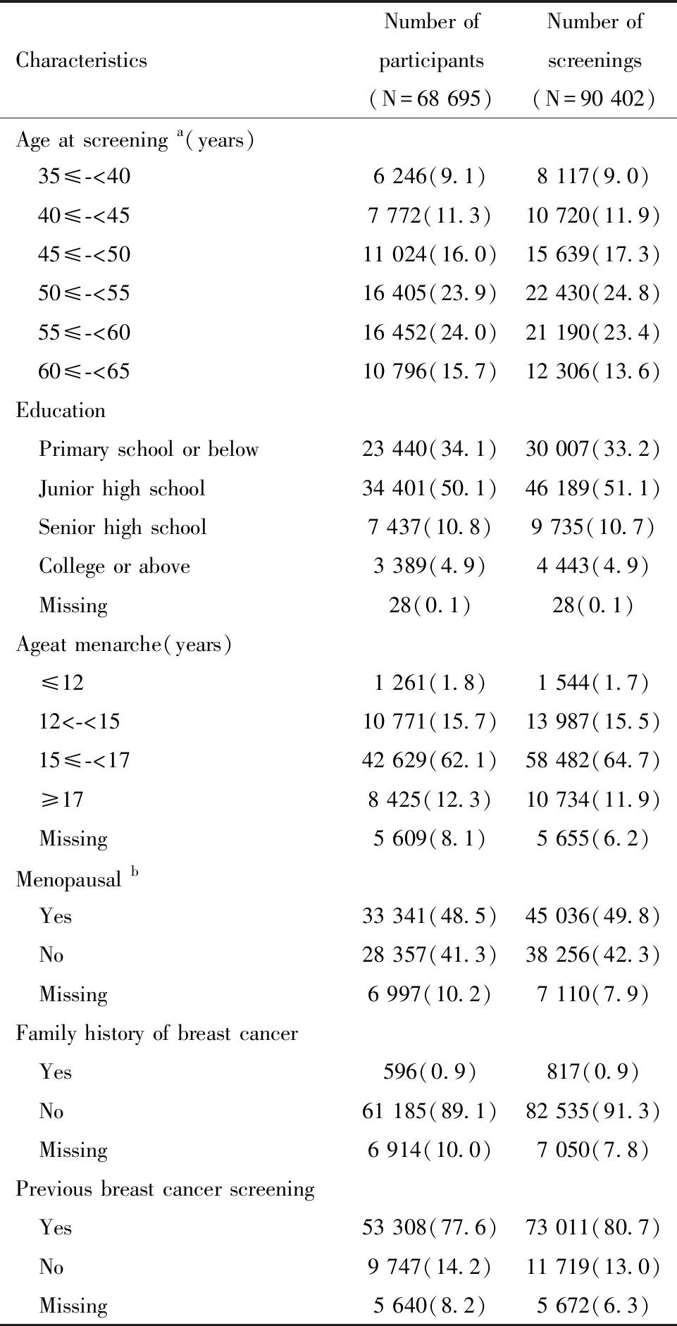 CharacteristicsNumber of participants (N=68 695)Number of screenings (N=90 402)Age at screening a(years) 35≤-<406 246(9.1)8 117(9.0) 40≤-<457 772(11.3)10 720(11.9) 45≤-<5011 024(16.0)15 639(17.3) 50≤-<5516 405(23.9)22 430(24.8) 55≤-<6016 452(24.0)21 190(23.4) 60≤-<6510 796(15.7)12 306(13.6)Education Primary school or below23 440(34.1)30 007(33.2) Junior high school34 401(50.1)46 189(51.1) Senior high school7 437(10.8)9 735(10.7) College or above3 389(4.9)4 443(4.9) Missing28(0.1)28(0.1)Ageat menarche(years) ≤121 261(1.8)1 544(1.7) 12<-<1510 771(15.7)13 987(15.5) 15≤-<1742 629(62.1)58 482(64.7) ≥178 425(12.3)10 734(11.9) Missing 5 609(8.1)5 655(6.2)Menopausal b Yes33 341(48.5)45 036(49.8) No28 357(41.3)38 256(42.3) Missing6 997(10.2)7 110(7.9)Family history of breast cancer Yes596(0.9)817(0.9) No61 185(89.1)82 535(91.3) Missing6 914(10.0)7 050(7.8)Previous breast cancer screening Yes53 308(77.6)73 011(80.7) No9 747(14.2)11 719(13.0) Missing5 640(8.2)5 672(6.3)