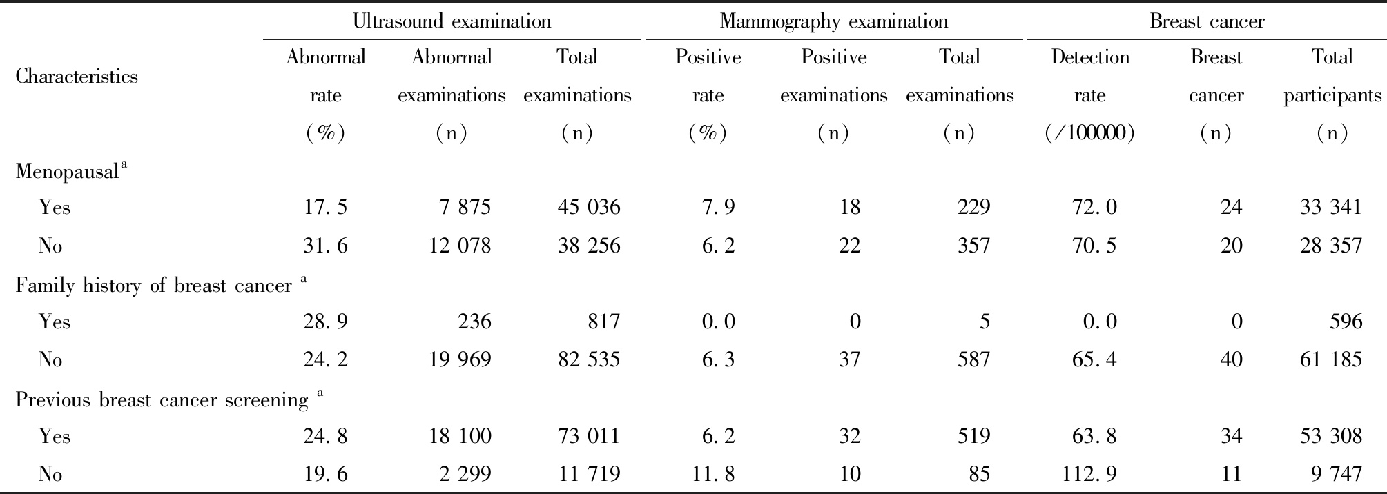 CharacteristicsUltrasound examinationAbnormal rate (%)Abnormal examinations (n)Totalexaminations (n)Mammography examinationPositive rate (%)Positive examinations (n)Totalexaminations (n)Breast cancerDetection rate (/100000)Breast cancer (n)Totalparticipants (n)Menopausala Yes17.57 87545 0367.91822972.02433 341 No31.612 07838 2566.22235770.52028 357Family history of breast cancer a Yes28.92368170.0050.00596 No24.219 96982 5356.33758765.44061 185Previous breast cancer screening a Yes24.818 10073 0116.23251963.83453 308 No19.62 29911 71911.81085112.9119 747