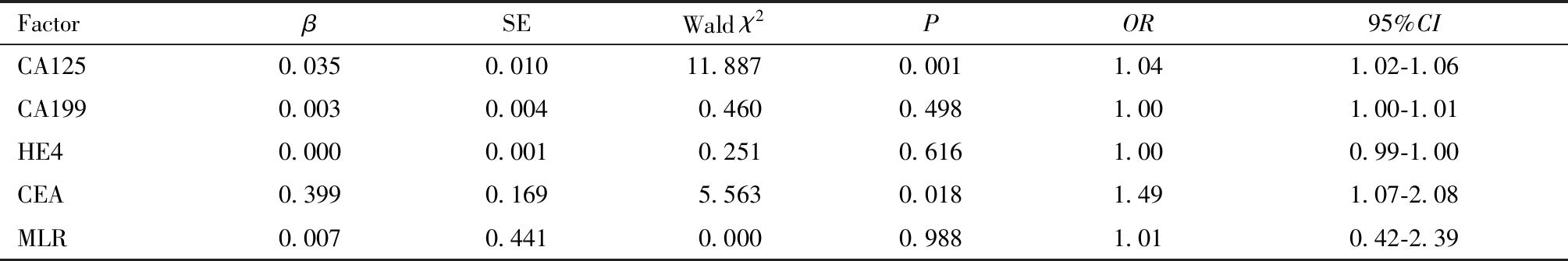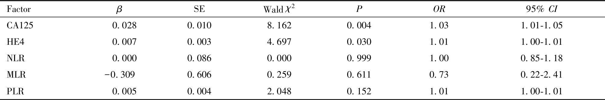 FactorβSEWald χ2POR95% CICA125 0.0280.0108.1620.0041.031.01-1.05HE4 0.0070.0034.6970.0301.011.00-1.01NLR 0.0000.0860.0000.9991.000.85-1.18MLR-0.3090.6060.2590.6110.730.22-2.41PLR 0.0050.0042.0480.1521.011.00-1.01
