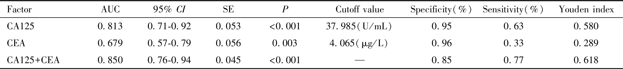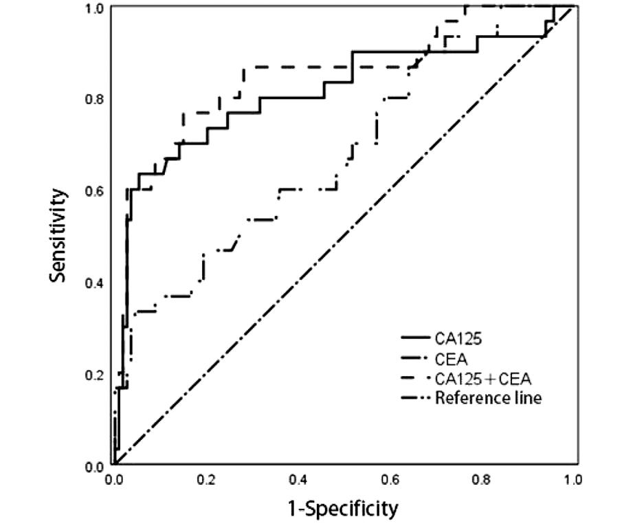 FactorAUC95% CISEPCutoff valueSpecificity(%)Sensitivity(%)Youden indexCA1250.8130.71-0.920.053<0.00137.985(U/mL)0.950.630.580CEA0.6790.57-0.790.0560.0034.065(μg/L)0.960.330.289CA125+CEA0.8500.76-0.940.045<0.001—0.850.770.618