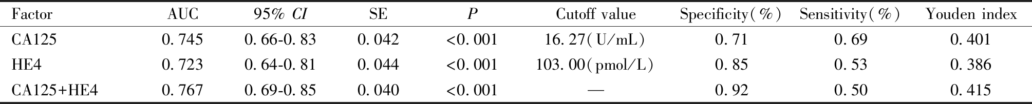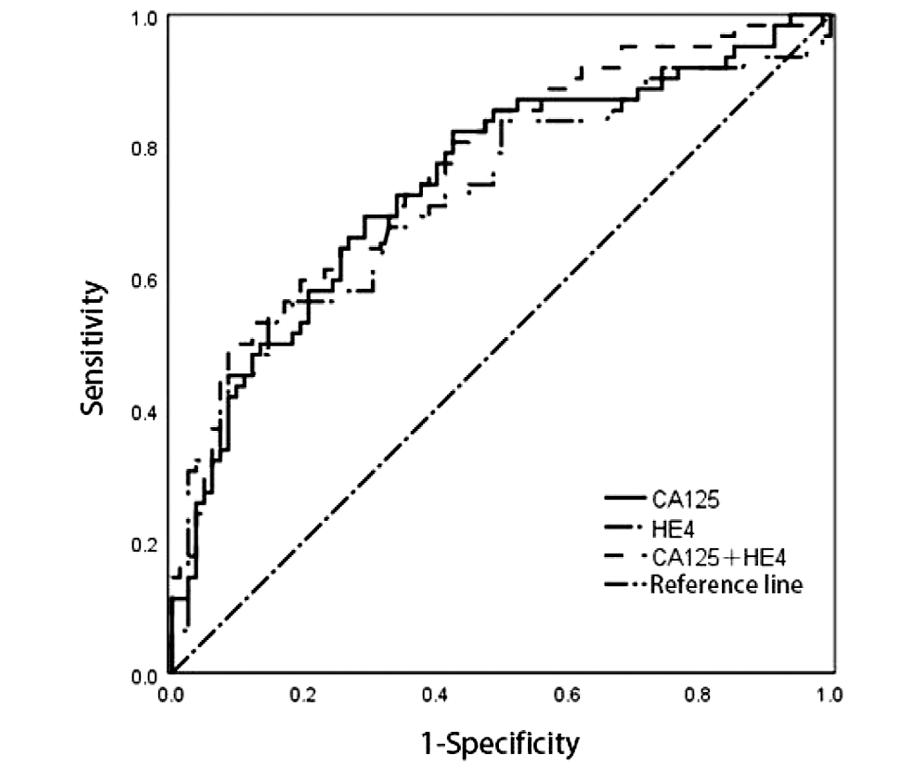 FactorAUC95% CISEPCutoff valueSpecificity(%)Sensitivity(%)Youden indexCA1250.7450.66-0.830.042<0.00116.27(U/mL)0.710.690.401HE40.7230.64-0.810.044<0.001103.00(pmol/L)0.850.530.386CA125+HE40.7670.69-0.850.040<0.001—0.920.500.415