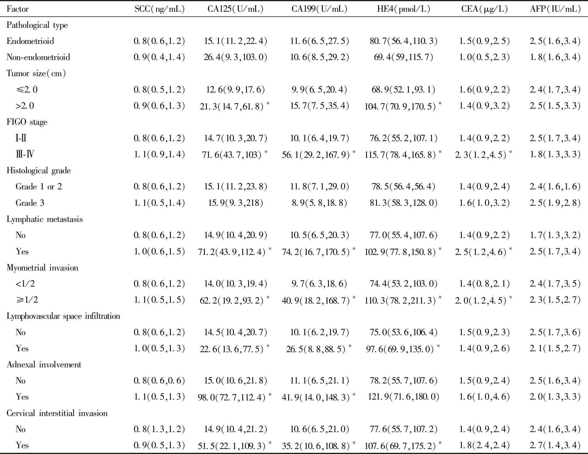 FactorSCC(ng/mL)CA125(U/mL)CA199(U/mL)HE4(pmol/L)CEA(μg/L)AFP(IU/mL)Pathological typeEndometrioid0.8(0.6,1.2)15.1(11.2,22.4)11.6(6.5,27.5)80.7(56.4,110.3)1.5(0.9,2.5)2.5(1.6,3.4)Non-endometrioid0.9(0.4,1.4)26.4(9.3,103.0)10.6(8.5,29.2)69.4(59,115.7)1.0(0.5,2.3)1.8(1.6,3.4)Tumor size(cm) ≤2.00.8(0.5,1.2)12.6(9.9,17.6)9.9(6.5,20.4)68.9(52.1,93.1)1.6(0.9,2.2)2.4(1.7,3.4) >2.00.9(0.6,1.3)21.3(14.7,61.8)∗15.7(7.5,35.4)104.7(70.9,170.5)∗1.4(0.9,3.2)2.5(1.5,3.3)FIGO stage Ⅰ-Ⅱ0.8(0.6,1.2)14.7(10.3,20.7)10.1(6.4,19.7)76.2(55.2,107.1)1.4(0.9,2.2)2.5(1.7,3.4) Ⅲ-Ⅳ1.1(0.9,1.4)71.6(43.7,103)∗56.1(29.2,167.9)∗115.7(78.4,165.8)∗2.3(1.2,4.5)∗1.8(1.3,3.3)Histological grade Grade 1 or 20.8(0.6,1.2)15.1(11.2,23.8)11.8(7.1,29.0)78.5(56.4,56.4)1.4(0.9,2.4)2.4(1.6,1.6) Grade 31.1(0.5,1.4)15.9(9.3,218)8.9(5.8,18.8)81.3(58.3,128.0)1.6(1.0,3.2)2.5(1.9,2.8)Lymphatic metastasis No0.8(0.6,1.2)14.9(10.4,20.9)10.5(6.5,20.3)77.0(55.4,107.6)1.4(0.9,2.2)1.7(1.3,3.2) Yes1.0(0.6,1.5)71.2(43.9,112.4)∗74.2(16.7,170.5)∗102.9(77.8,150.8)∗2.5(1.2,4.6)∗2.5(1.7,3.4)Myometrial invasion <1/20.8(0.6,1.2)14.0(10.3,19.4)9.7(6.3,18.6)74.4(53.2,103.0)1.4(0.8,2.1)2.4(1.7,3.5) ≥1/21.1(0.5,1.5)62.2(19.2,93.2)∗40.9(18.2,168.7)∗110.3(78.2,211.3)∗2.0(1.2,4.5)∗2.3(1.5,2.7)Lymphovascular space infiltration No0.8(0.6,1.2)14.5(10.4,20.7)10.1(6.2,19.7)75.0(53.6,106.4)1.5(0.9,2.3)2.5(1.7,3.6) Yes1.0(0.5,1.3)22.6(13.6,77.5)∗26.5(8.8,88.5)∗97.6(69.9,135.0)∗1.4(0.9,2.6)2.1(1.5,2.7)Adnexal involvement No0.8(0.6,0.6)15.0(10.6,21.8)11.1(6.5,21.1)78.2(55.7,107.6)1.5(0.9,2.4)2.5(1.6,3.4) Yes1.1(0.5,1.3)98.0(72.7,112.4)∗41.9(14.0,148.3)∗121.9(71.6,180.0)1.6(1.0,4.6)2.0(1.3,3.3)Cervical interstitial invasion No0.8(1.3,1.2)14.9(10.4,21.2)10.6(6.5,21.0)77.6(55.7,107.2)1.4(0.9,2.4)2.4(1.6,3.4) Yes0.9(0.5,1.3)51.5(22.1,109.3)∗35.2(10.6,108.8)∗107.6(69.7,175.2)∗1.8(2.4,2.4)2.7(1.4,3.4)