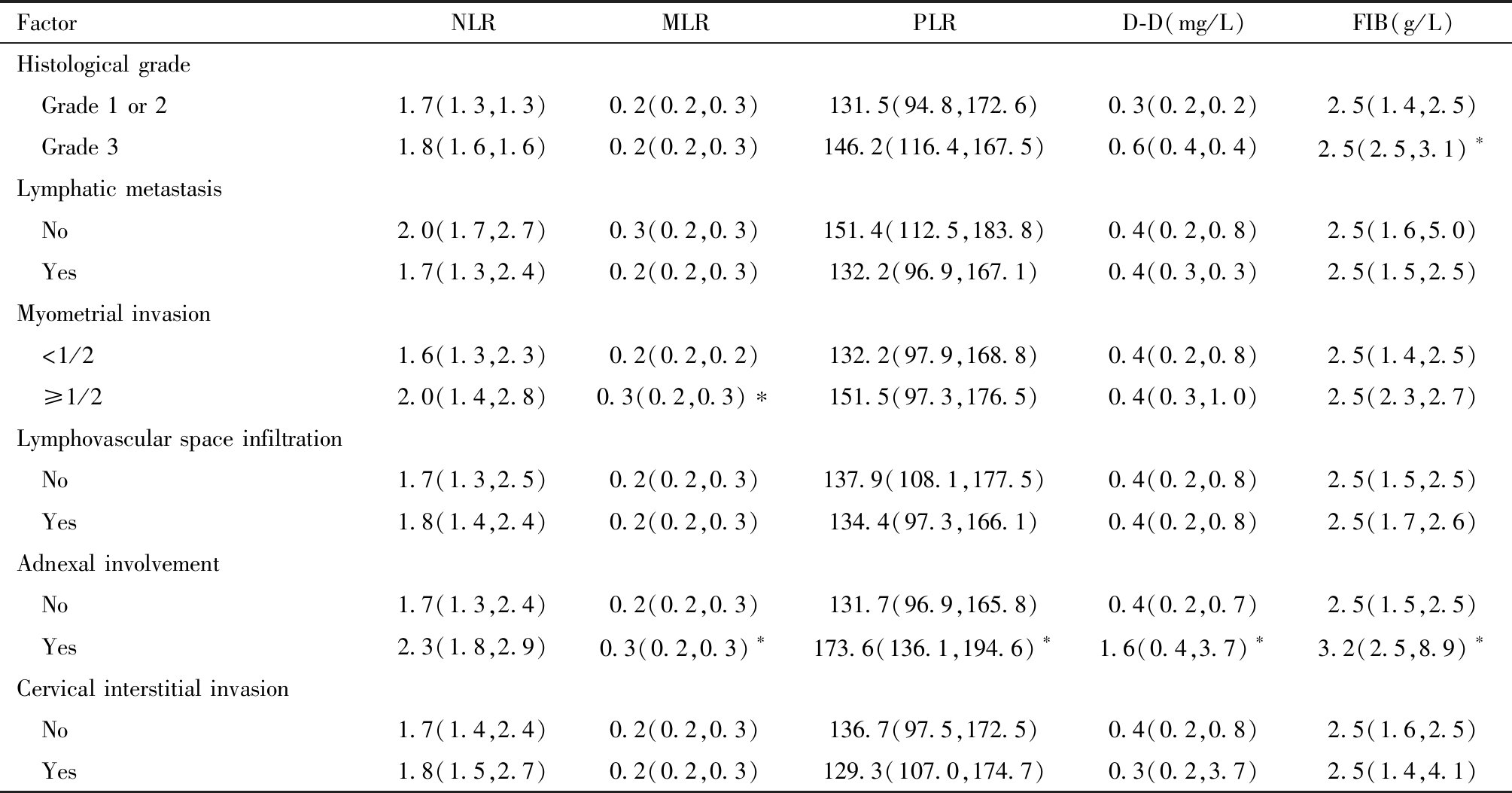 FactorNLRMLRPLRD-D(mg/L)FIB(g/L)Histological grade Grade 1 or 21.7(1.3,1.3)0.2(0.2,0.3)131.5(94.8,172.6)0.3(0.2,0.2)2.5(1.4,2.5) Grade 31.8(1.6,1.6)0.2(0.2,0.3)146.2(116.4,167.5)0.6(0.4,0.4)2.5(2.5,3.1)∗Lymphatic metastasis No2.0(1.7,2.7)0.3(0.2,0.3)151.4(112.5,183.8)0.4(0.2,0.8)2.5(1.6,5.0) Yes1.7(1.3,2.4)0.2(0.2,0.3)132.2(96.9,167.1)0.4(0.3,0.3)2.5(1.5,2.5)Myometrial invasion <1/21.6(1.3,2.3)0.2(0.2,0.2)132.2(97.9,168.8)0.4(0.2,0.8)2.5(1.4,2.5) ≥1/22.0(1.4,2.8)0.3(0.2,0.3)∗151.5(97.3,176.5)0.4(0.3,1.0)2.5(2.3,2.7)Lymphovascular space infiltration No1.7(1.3,2.5)0.2(0.2,0.3)137.9(108.1,177.5)0.4(0.2,0.8)2.5(1.5,2.5) Yes1.8(1.4,2.4)0.2(0.2,0.3)134.4(97.3,166.1)0.4(0.2,0.8)2.5(1.7,2.6)Adnexal involvement No1.7(1.3,2.4)0.2(0.2,0.3)131.7(96.9,165.8)0.4(0.2,0.7)2.5(1.5,2.5) Yes2.3(1.8,2.9)0.3(0.2,0.3)∗173.6(136.1,194.6)∗1.6(0.4,3.7)∗3.2(2.5,8.9)∗Cervical interstitial invasion No1.7(1.4,2.4)0.2(0.2,0.3)136.7(97.5,172.5)0.4(0.2,0.8)2.5(1.6,2.5) Yes1.8(1.5,2.7)0.2(0.2,0.3)129.3(107.0,174.7)0.3(0.2,3.7)2.5(1.4,4.1)
