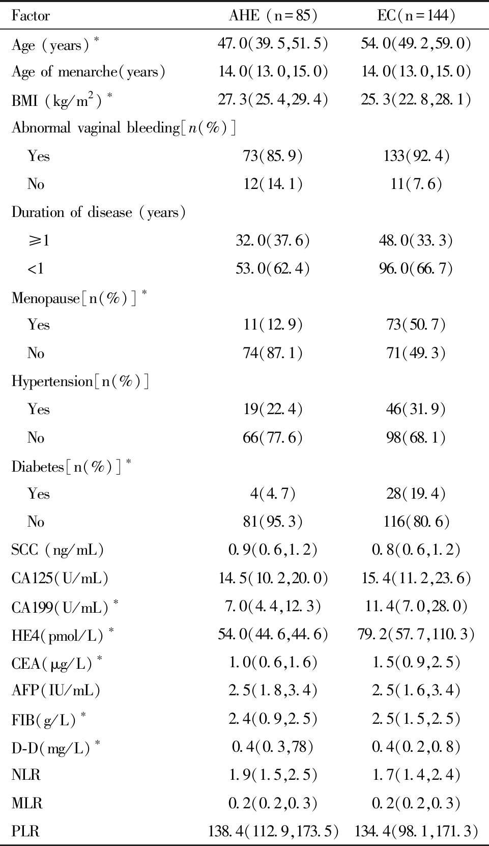 FactorAHE (n=85)EC(n=144)Age (years)∗47.0(39.5,51.5)54.0(49.2,59.0)Age of menarche(years)14.0(13.0,15.0)14.0(13.0,15.0)BMI (kg/m2)∗27.3(25.4,29.4)25.3(22.8,28.1)Abnormal vaginal bleeding[n(%)] Yes73(85.9)133(92.4) No12(14.1)11(7.6)Duration of disease (years) ≥132.0(37.6)48.0(33.3) <153.0(62.4)96.0(66.7)Menopause[n(%)]∗ Yes11(12.9)73(50.7) No74(87.1)71(49.3)Hypertension[n(%)] Yes19(22.4)46(31.9) No66(77.6)98(68.1)Diabetes[n(%)]∗ Yes4(4.7)28(19.4) No81(95.3)116(80.6)SCC (ng/mL)0.9(0.6,1.2)0.8(0.6,1.2)CA125(U/mL)14.5(10.2,20.0)15.4(11.2,23.6)CA199(U/mL) ∗7.0(4.4,12.3)11.4(7.0,28.0)HE4(pmol/L) ∗54.0(44.6,44.6)79.2(57.7,110.3)CEA(μg/L) ∗1.0(0.6,1.6)1.5(0.9,2.5)AFP(IU/mL)2.5(1.8,3.4)2.5(1.6,3.4)FIB(g/L) ∗2.4(0.9,2.5)2.5(1.5,2.5)D-D(mg/L) ∗0.4(0.3,78)0.4(0.2,0.8)NLR1.9(1.5,2.5)1.7(1.4,2.4)MLR0.2(0.2,0.3)0.2(0.2,0.3)PLR138.4(112.9,173.5)134.4(98.1,171.3)