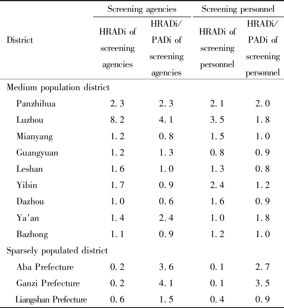 DistrictScreening agenciesHRADi of screening agenciesHRADi/PADi of screening agenciesScreening personnelHRADi of screening personnelHRADi/PADi of screening personnelMedium population district Panzhihua2.32.32.12.0 Luzhou8.24.13.51.8 Mianyang1.20.81.51.0 Guangyuan1.21.30.80.9 Leshan1.61.01.30.8 Yibin1.70.92.41.2 Dazhou1.00.61.60.9 Ya′an1.42.41.01.8 Bazhong1.10.91.21.0Sparsely populated district Aba Prefecture0.23.60.12.7 Ganzi Prefecture0.24.10.13.5 Liangshan Prefecture0.61.50.40.9