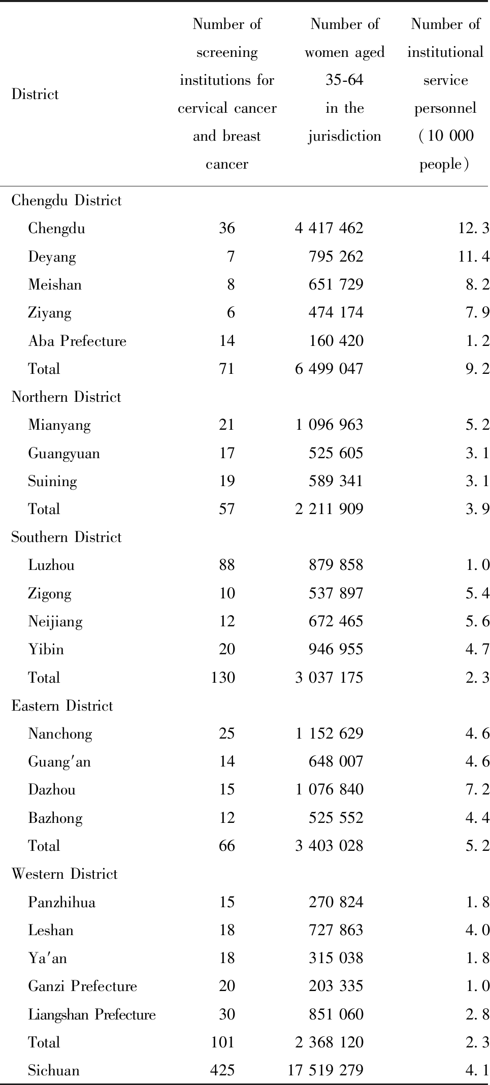 DistrictNumber of screening institutions for cervical cancer and breast cancerNumber of women aged 35-64 in the jurisdictionNumber of institutional service personnel (10 000 people)Chengdu District Chengdu364 417 46212.3 Deyang7795 26211.4 Meishan8651 7298.2 Ziyang6474 1747.9 Aba Prefecture14160 4201.2 Total716 499 0479.2Northern District Mianyang211 096 9635.2 Guangyuan17525 6053.1 Suining19589 3413.1 Total572 211 9093.9Southern District Luzhou88879 8581.0 Zigong10537 8975.4 Neijiang12672 4655.6 Yibin20946 9554.7 Total1303 037 1752.3Eastern District Nanchong251 152 6294.6 Guang′an14648 0074.6 Dazhou151 076 8407.2 Bazhong12525 5524.4 Total663 403 0285.2Western District Panzhihua15270 8241.8 Leshan18727 8634.0 Ya′an18315 0381.8 Ganzi Prefecture20203 3351.0 Liangshan Prefecture30851 0602.8 Total1012 368 1202.3 Sichuan42517 519 2794.1