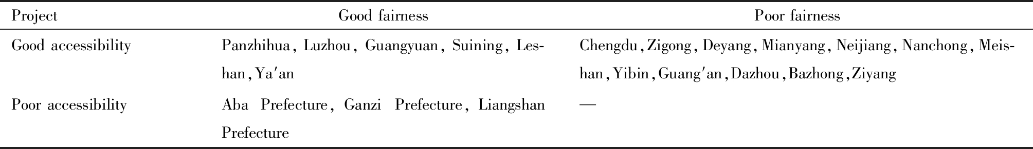 ProjectGood fairnessPoor fairnessGood accessibilityPanzhihua,Luzhou,Guangyuan,Suining,Les-han,Ya′anChengdu,Zigong,Deyang,Mianyang,Neijiang,Nanchong,Meis-han,Yibin,Guang′an,Dazhou,Bazhong,ZiyangPoor accessibilityAba Prefecture,Ganzi Prefecture,Liangshan Prefecture—