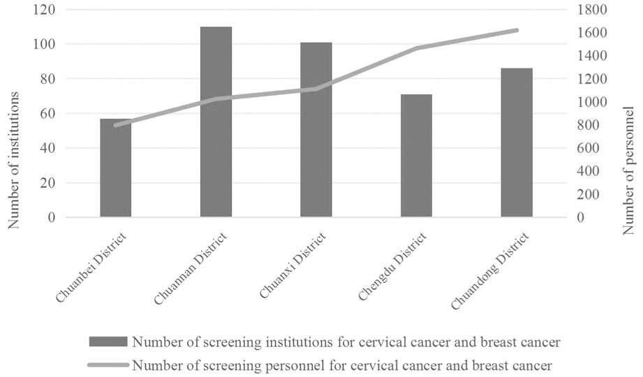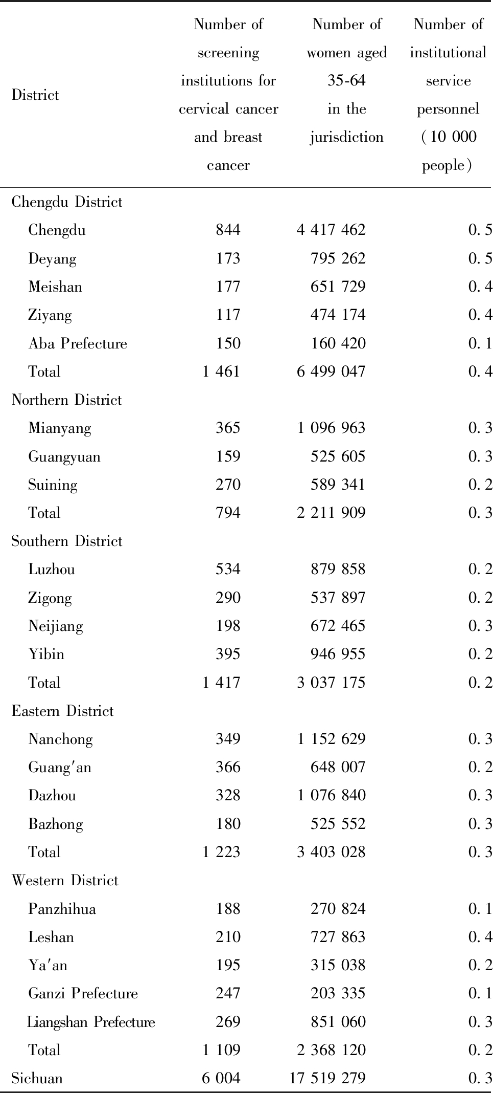 DistrictNumber of screening institutions for cervical cancer and breast cancerNumber of women aged 35-64 in the jurisdictionNumber of institutional service personnel (10 000 people)Chengdu District Chengdu8444 417 4620.5 Deyang173795 2620.5 Meishan177651 7290.4 Ziyang117474 1740.4 Aba Prefecture150160 4200.1 Total1 4616 499 0470.4Northern District Mianyang3651 096 9630.3 Guangyuan159525 6050.3 Suining270589 3410.2 Total7942 211 9090.3Southern District Luzhou534879 8580.2 Zigong290537 8970.2 Neijiang198672 4650.3 Yibin395946 9550.2 Total1 4173 037 1750.2Eastern District Nanchong3491 152 6290.3 Guang′an366648 0070.2 Dazhou3281 076 8400.3 Bazhong180525 5520.3 Total1 2233 403 0280.3Western District Panzhihua188270 8240.1 Leshan210727 8630.4 Ya′an195315 0380.2 Ganzi Prefecture247203 3350.1 Liangshan Prefecture269851 0600.3 Total1 1092 368 1200.2Sichuan6 00417 519 2790.3