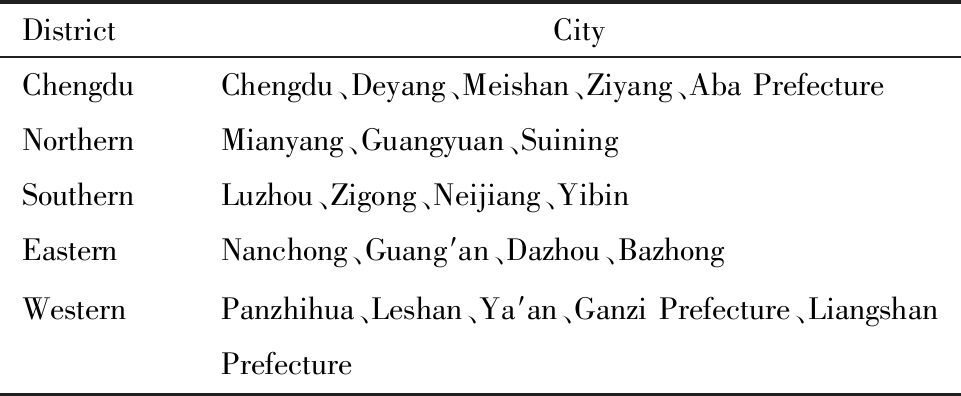 DistrictCityChengduChengdu、Deyang、Meishan、Ziyang、Aba PrefectureNorthernMianyang、Guangyuan、SuiningSouthernLuzhou、Zigong、Neijiang、YibinEasternNanchong、Guang′an、Dazhou、BazhongWesternPanzhihua、Leshan、Ya′an、Ganzi Prefecture、Liangshan Prefecture