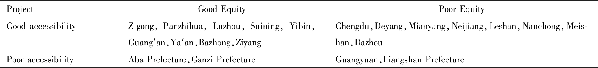 综上所述,将四川省21个地市分为四类:第一类是可及性与公平性均较好的地市,第二类是可及性较好但公平性较差的地市,第三类是可及性较差但公平性较好的地市,第四类是公平性与可及性均较差的地市。见表5。