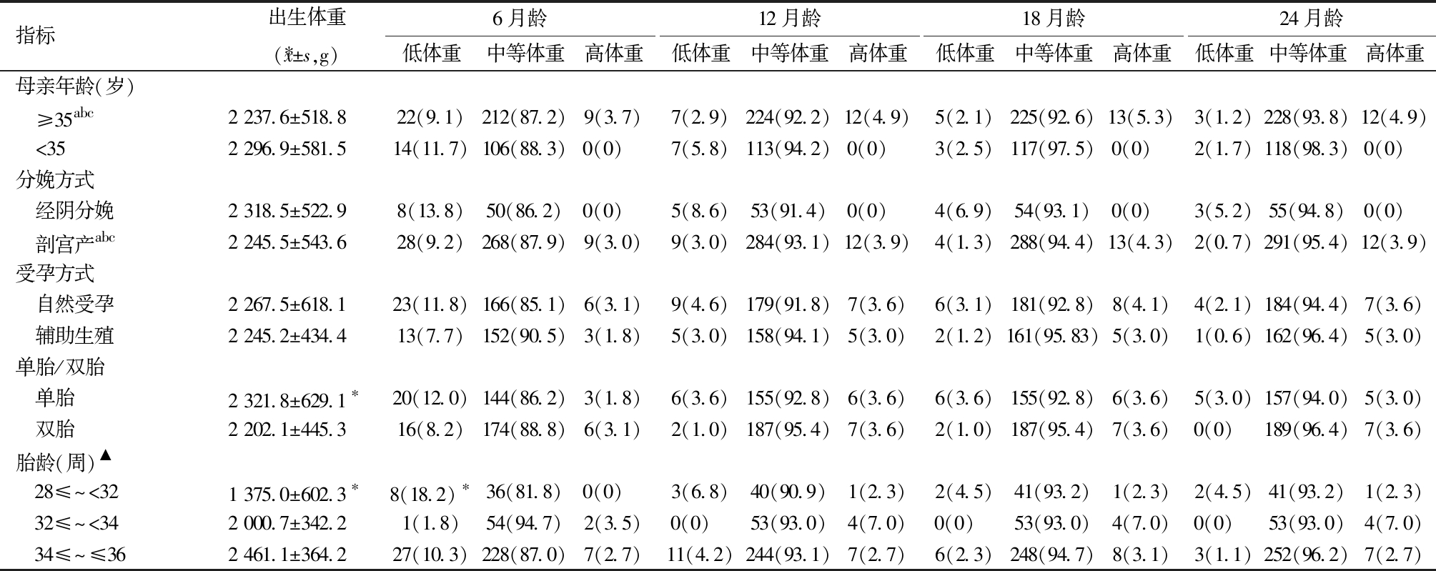 指标出生体重( x±s,g)6月龄低体重中等体重高体重12月龄低体重中等体重高体重18月龄低体重中等体重高体重24月龄低体重中等体重高体重母亲年龄(岁) ≥35abc2 237.6±518.822(9.1)212(87.2)9(3.7)7(2.9)224(92.2)12(4.9)5(2.1)225(92.6)13(5.3)3(1.2)228(93.8)12(4.9) <352 296.9±581.514(11.7)106(88.3)0(0) 7(5.8)113(94.2)0(0) 3(2.5)117(97.5)0(0) 2(1.7)118(98.3)0(0) 分娩方式 经阴分娩2 318.5±522.98(13.8)50(86.2)0(0) 5(8.6)53(91.4)0(0) 4(6.9)54(93.1)0(0) 3(5.2)55(94.8)0(0) 剖宫产abc2 245.5±543.628(9.2)268(87.9)9(3.0)9(3.0)284(93.1)12(3.9)4(1.3)288(94.4)13(4.3)2(0.7)291(95.4)12(3.9)受孕方式 自然受孕2 267.5±618.123(11.8)166(85.1)6(3.1)9(4.6)179(91.8)7(3.6)6(3.1)181(92.8)8(4.1)4(2.1)184(94.4)7(3.6) 辅助生殖2 245.2±434.413(7.7)152(90.5)3(1.8)5(3.0)158(94.1)5(3.0)2(1.2)161(95.83)5(3.0)1(0.6)162(96.4)5(3.0)单胎/双胎 单胎2 321.8±629.1∗20(12.0)144(86.2)3(1.8)6(3.6)155(92.8)6(3.6)6(3.6)155(92.8)6(3.6)5(3.0)157(94.0)5(3.0) 双胎2 202.1±445.316(8.2)174(88.8)6(3.1)2(1.0)187(95.4)7(3.6)2(1.0)187(95.4)7(3.6)0(0) 189(96.4)7(3.6)胎龄(周)▲ 28≤~<321 375.0±602.3∗8(18.2)∗36(81.8)0(0) 3(6.8)40(90.9)1(2.3)2(4.5)41(93.2)1(2.3)2(4.5)41(93.2)1(2.3) 32≤~<342 000.7±342.21(1.8)54(94.7)2(3.5)0(0) 53(93.0)4(7.0)0(0) 53(93.0)4(7.0)0(0) 53(93.0)4(7.0) 34≤~≤36 2 461.1±364.227(10.3)228(87.0)7(2.7)11(4.2)244(93.1)7(2.7)6(2.3)248(94.7)8(3.1)3(1.1)252(96.2)7(2.7)
