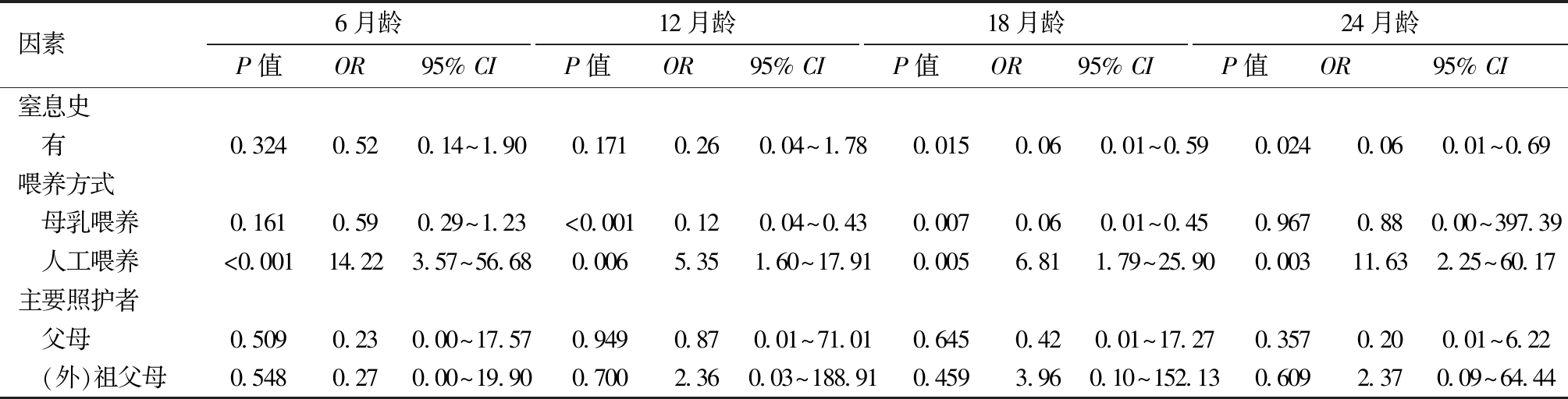 因素6月龄P值OR95% CI 12月龄P值OR95% CI 18月龄P值OR95% CI 24月龄P值OR95% CI 窒息史 有0.3240.520.14~1.900.1710.260.04~1.780.0150.060.01~0.590.0240.060.01~0.69喂养方式 母乳喂养0.1610.590.29~1.23<0.0010.120.04~0.430.0070.060.01~0.450.9670.880.00~397.39 人工喂养<0.00114.223.57~56.680.0065.351.60~17.910.0056.811.79~25.900.00311.632.25~60.17主要照护者 父母0.5090.230.00~17.570.9490.870.01~71.010.6450.420.01~17.270.3570.200.01~6.22 (外)祖父母0.5480.270.00~19.900.7002.360.03~188.910.4593.960.10~152.130.6092.370.09~64.44