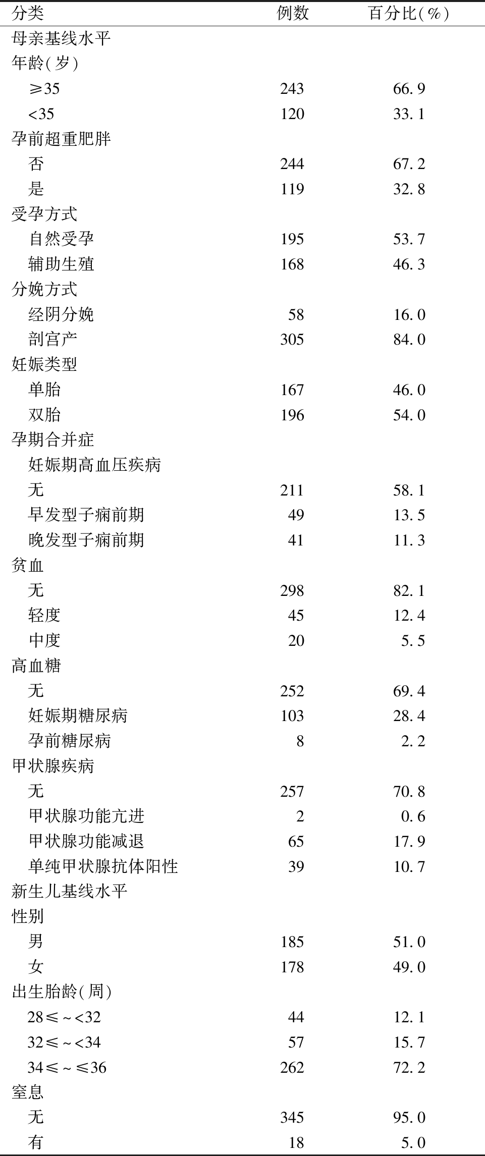 分类例数百分比(%)母亲基线水平年龄(岁) ≥3524366.9 <3512033.1孕前超重肥胖 否24467.2 是11932.8受孕方式 自然受孕19553.7 辅助生殖16846.3分娩方式 经阴分娩5816.0 剖宫产30584.0妊娠类型 单胎16746.0 双胎19654.0孕期合并症 妊娠期高血压疾病 无21158.1 早发型子痫前期4913.5 晚发型子痫前期4111.3贫血 无29882.1 轻度4512.4 中度205.5高血糖 无25269.4 妊娠期糖尿病10328.4 孕前糖尿病82.2甲状腺疾病 无25770.8 甲状腺功能亢进20.6 甲状腺功能减退6517.9 单纯甲状腺抗体阳性3910.7新生儿基线水平性别 男18551.0 女17849.0出生胎龄(周) 28≤~<324412.1 32≤~<345715.7 34≤~≤3626272.2窒息 无34595.0 有185.0
