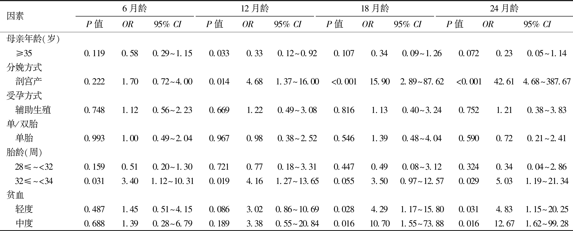 因素6月龄P值OR95% CI 12月龄P值OR95% CI 18月龄P值OR95% CI 24月龄P值OR95% CI 母亲年龄(岁) ≥350.1190.580.29~1.150.0330.330.12~0.920.1070.340.09~1.260.0720.230.05~1.14分娩方式 剖宫产0.2221.700.72~4.000.0144.681.37~16.00<0.00115.902.89~87.62<0.00142.614.68~387.67受孕方式 辅助生殖0.7481.120.56~2.230.6691.220.49~3.080.8161.130.40~3.240.7521.210.38~3.83单/双胎 单胎0.9931.000.49~2.040.9670.980.38~2.520.5461.390.48~4.040.5900.720.21~2.41胎龄(周) 28≤~<320.1590.510.20~1.300.7210.770.18~3.310.4470.490.08~3.120.3240.340.04~2.86 32≤~<340.0313.401.12~10.310.0194.161.27~13.650.0553.500.97~12.570.0295.031.19~21.34贫血 轻度0.4871.450.51~4.150.0863.020.86~10.690.0284.291.17~15.800.0314.831.15~20.25 中度0.6881.390.28~6.790.1893.380.55~20.840.01610.701.55~73.880.01612.671.62~99.28
