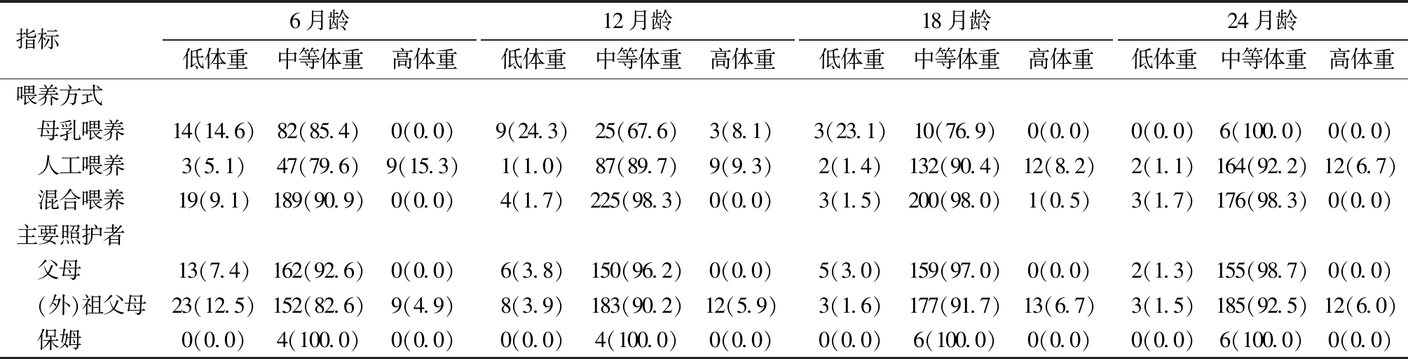 指标6月龄低体重中等体重高体重12月龄低体重中等体重高体重18月龄低体重中等体重高体重24月龄低体重中等体重高体重喂养方式 母乳喂养14(14.6)82(85.4)0(0.0)9(24.3)25(67.6)3(8.1)3(23.1)10(76.9)0(0.0)0(0.0)6(100.0)0(0.0) 人工喂养3(5.1)47(79.6)9(15.3)1(1.0)87(89.7)9(9.3)2(1.4)132(90.4)12(8.2)2(1.1)164(92.2)12(6.7) 混合喂养19(9.1)189(90.9)0(0.0)4(1.7)225(98.3)0(0.0)3(1.5)200(98.0)1(0.5)3(1.7)176(98.3)0(0.0)主要照护者 父母13(7.4)162(92.6)0(0.0)6(3.8)150(96.2)0(0.0)5(3.0)159(97.0)0(0.0)2(1.3)155(98.7)0(0.0) (外)祖父母23(12.5)152(82.6)9(4.9)8(3.9)183(90.2)12(5.9)3(1.6)177(91.7)13(6.7)3(1.5)185(92.5)12(6.0) 保姆0(0.0)4(100.0)0(0.0)0(0.0)4(100.0)0(0.0)0(0.0)6(100.0)0(0.0)0(0.0)6(100.0)0(0.0)