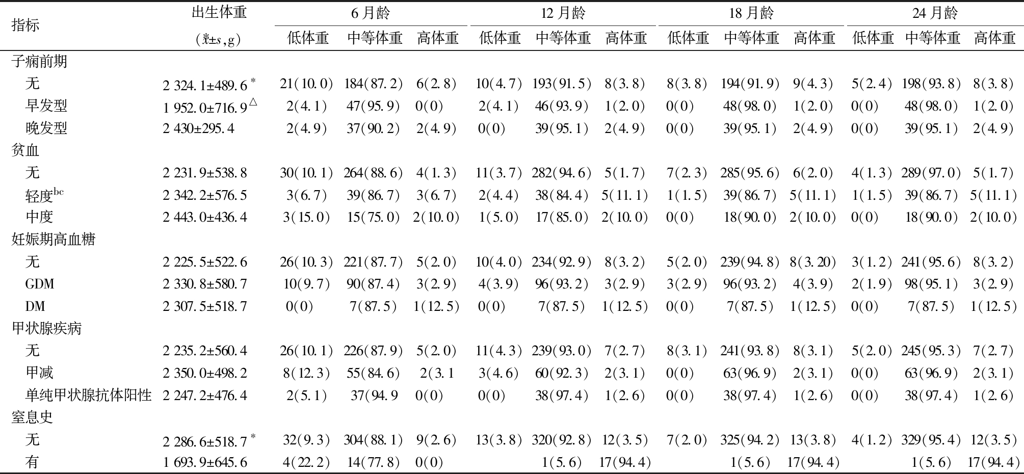 指标出生体重( x±s,g)6月龄低体重中等体重高体重12月龄低体重中等体重高体重18月龄低体重中等体重高体重24月龄低体重中等体重高体重子痫前期 无2 324.1±489.6∗21(10.0)184(87.2)6(2.8)10(4.7)193(91.5)8(3.8)8(3.8)194(91.9)9(4.3)5(2.4)198(93.8)8(3.8) 早发型1 952.0±716.9△2(4.1)47(95.9)0(0) 2(4.1)46(93.9)1(2.0)0(0) 48(98.0)1(2.0)0(0) 48(98.0)1(2.0) 晚发型2 430±295.42(4.9)37(90.2)2(4.9)0(0) 39(95.1)2(4.9)0(0) 39(95.1)2(4.9)0(0) 39(95.1)2(4.9)贫血 无2 231.9±538.830(10.1)264(88.6)4(1.3)11(3.7)282(94.6)5(1.7)7(2.3)285(95.6)6(2.0)4(1.3)289(97.0)5(1.7) 轻度bc2 342.2±576.53(6.7)39(86.7)3(6.7)2(4.4)38(84.4)5(11.1)1(1.5)39(86.7)5(11.1)1(1.5)39(86.7)5(11.1) 中度2 443.0±436.43(15.0)15(75.0)2(10.0)1(5.0)17(85.0)2(10.0)0(0) 18(90.0)2(10.0)0(0) 18(90.0)2(10.0)妊娠期高血糖 无2 225.5±522.626(10.3)221(87.7)5(2.0)10(4.0)234(92.9)8(3.2)5(2.0)239(94.8)8(3.20)3(1.2)241(95.6)8(3.2) GDM2 330.8±580.710(9.7)90(87.4)3(2.9)4(3.9)96(93.2)3(2.9)3(2.9)96(93.2)4(3.9)2(1.9)98(95.1)3(2.9) DM2 307.5±518.70(0) 7(87.5)1(12.5)0(0) 7(87.5)1(12.5)0(0) 7(87.5)1(12.5)0(0) 7(87.5)1(12.5)甲状腺疾病 无2 235.2±560.426(10.1)226(87.9)5(2.0)11(4.3)239(93.0)7(2.7)8(3.1)241(93.8)8(3.1)5(2.0)245(95.3)7(2.7) 甲减2 350.0±498.28(12.3)55(84.6)2(3.13(4.6)60(92.3)2(3.1)0(0) 63(96.9)2(3.1)0(0) 63(96.9)2(3.1) 单纯甲状腺抗体阳性2 247.2±476.42(5.1)37(94.90(0) 0(0) 38(97.4)1(2.6)0(0) 38(97.4)1(2.6)0(0) 38(97.4)1(2.6)窒息史 无2 286.6±518.7∗32(9.3)304(88.1)9(2.6)13(3.8)320(92.8)12(3.5)7(2.0)325(94.2)13(3.8)4(1.2)329(95.4)12(3.5) 有1 693.9±645.64(22.2)14(77.8)0(0) 1(5.6)17(94.4)1(5.6)17(94.4)1(5.6)17(94.4)