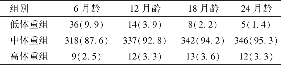 组别 6月龄12月龄18月龄24月龄低体重组36(9.9)14(3.9)8(2.2)5(1.4)中体重组318(87.6)337(92.8)342(94.2)346(95.3)高体重组9(2.5)12(3.3)13(3.6)12(3.3)
