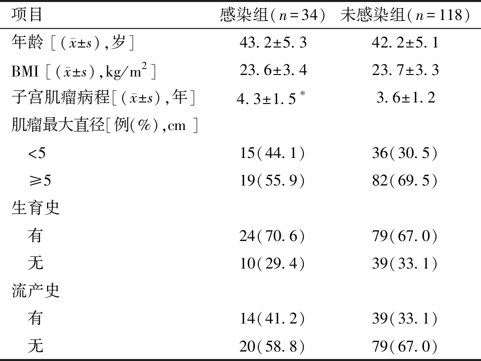 项目感染组(n=34)未感染组(n=118)年龄 [( x±s),岁]43.2±5.342.2±5.1BMI [( x±s),kg/m2]23.6±3.423.7±3.3子宫肌瘤病程[( x±s),年] 4.3±1.5∗3.6±1.2肌瘤最大直径[例(%),cm ] <515(44.1)36(30.5) ≥519(55.9)82(69.5)生育史 有24(70.6)79(67.0) 无10(29.4)39(33.1)流产史 有14(41.2)39(33.1) 无20(58.8)79(67.0)