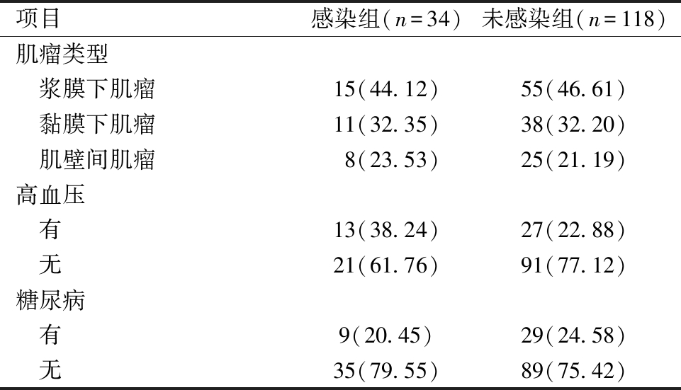 项目感染组(n=34)未感染组(n=118)肌瘤类型 浆膜下肌瘤15(44.12)55(46.61) 黏膜下肌瘤11(32.35)38(32.20) 肌壁间肌瘤8(23.53)25(21.19)高血压 有13(38.24)27(22.88) 无21(61.76)91(77.12)糖尿病 有9(20.45)29(24.58) 无35(79.55)89(75.42)