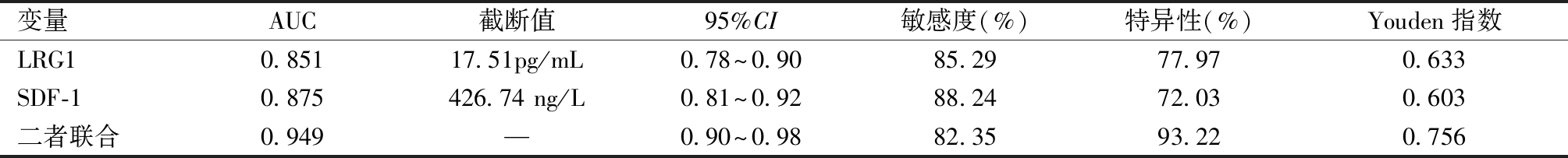 变量AUC截断值95%CI敏感度(%)特异性(%)Youden指数LRG10.85117.51pg/mL0.78~0.9085.2977.970.633SDF-10.875426.74 ng/L0.81~0.9288.2472.030.603二者联合0.949—0.90~0.9882.3593.220.756