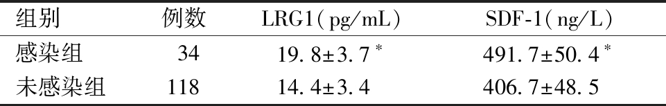 4.感染组和未感染组血清LRG1、SDF-1水平比较:与未感染组比较,感染组血清LRG1、SDF-1水平均明显升高(P<0.05)。见表2。
