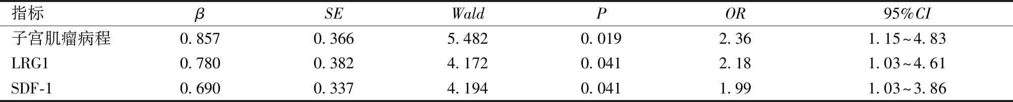 5.多因素Logistic回归分析子宫肌瘤患者微创术后发生泌尿系感染的影响因素:以子宫肌瘤患者微创术后是否发生泌尿系感染(是=1,否=0)为因变量,以子宫肌瘤病程(实测值)、LRG1(实测值)、SDF-1(实测值)为自变量,多因素Logistic回归分析结果显示,子宫肌瘤病程、LRG1、SDF-1均为子宫肌瘤患者微创术后发生泌尿系感染的影响因素(P<0.05)。见表5。