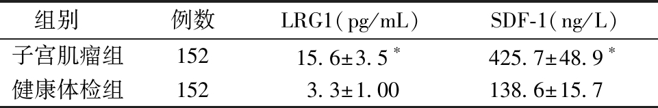 表2 子宫肌瘤组和健康体检组血清LRG1、SDF-1水平比较