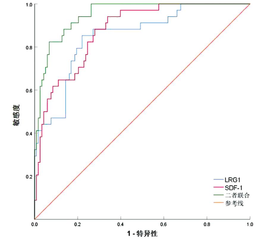 3.方法:所有患者入院后次日及健康者体检当日早晨取空腹静脉血5 mL,离心10 min,分离血清,在-80℃冰箱中保存。采用ELISA对血清LRG1、SDF-1水平进行检测,吸取50 μL血清样品加入96孔板中,放置在37℃孵育1 h后洗涤,加入酶标抗体,放置在37℃孵育1 h后洗涤,加入显色液50 μL,放置在37℃孵育20 min显色,加入50 μL的2 mol/L硫酸终止反应,最后用酶标仪测定。