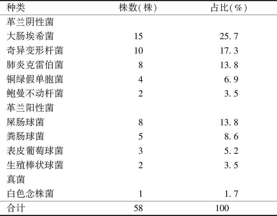 种类株数(株)占比(%)革兰阴性菌大肠埃希菌1525.7奇异变形杆菌1017.3肺炎克雷伯菌813.8铜绿假单胞菌46.9鲍曼不动杆菌23.5革兰阳性菌屎肠球菌813.8粪肠球菌58.6表皮葡萄球菌35.2生殖棒状球菌23.5真菌白色念株菌11.7合计58100