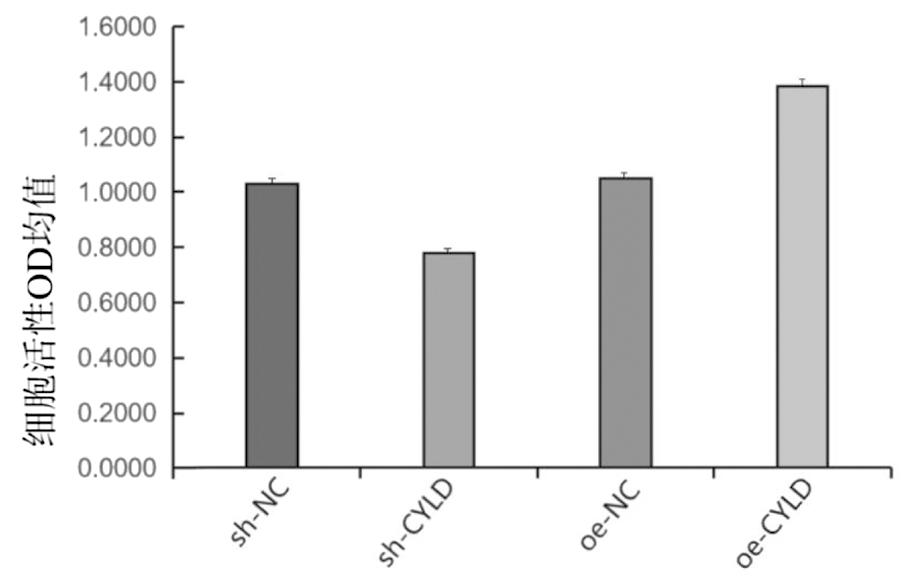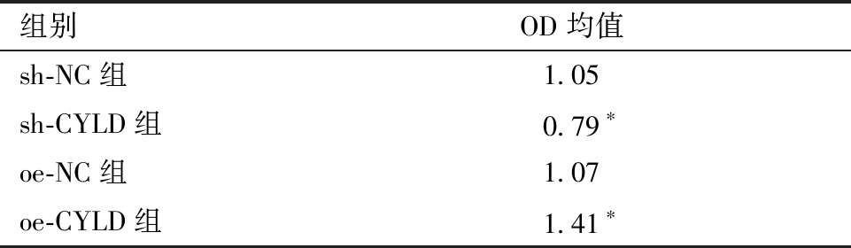 (5)Western blot检测CYLD表达量。细胞样本经RIPA裂解液离心后取上清液即为细胞全蛋白,以BCA法测定蛋白浓度后进行电泳及转膜,用1×PBST配制5%脱脂奶粉或BSA溶液对膜进行封闭,一抗4℃孵育10 min后用PBST漂洗3次;二抗4℃孵育15 min后同样漂洗3次。再将膜与ECL化学发光液孵育1 min,用滤纸吸尽残留液体后用塑封膜将膜包裹杂交膜,最后通过凝胶成像系统采集图像。免疫印迹采用CYLD和内参β-actin抗体。