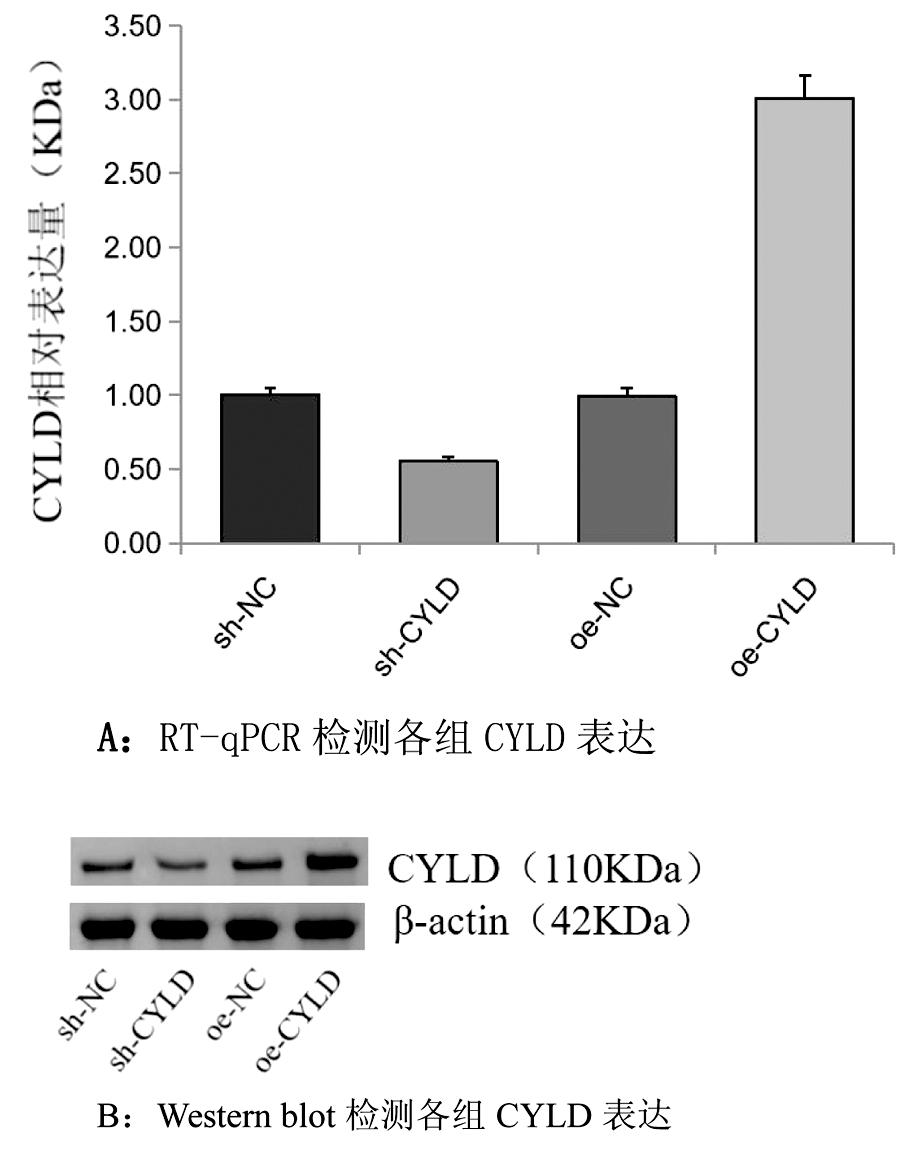 (4)RT-qPCR检测CYLD表达。将过表达干预的各实验组中加入1 mL Trizol于匀浆器中充分研磨匀浆,按照Trizol法标准提取细胞总RNA,通过微量分光光度计检测RNA在260 nm和280 nm处的吸光度以评估其浓度与纯度。合格的RNA逆转录为cDNA后配制为RT-PCR反应体系。反应条件设置为:95℃变性10 min,95℃退火15 s,共进行40个循环,60℃延长30 s,采用2-ΔΔCt法进行数据分析。并以β-actin作为内部参考基因,引物序列信息见表1。