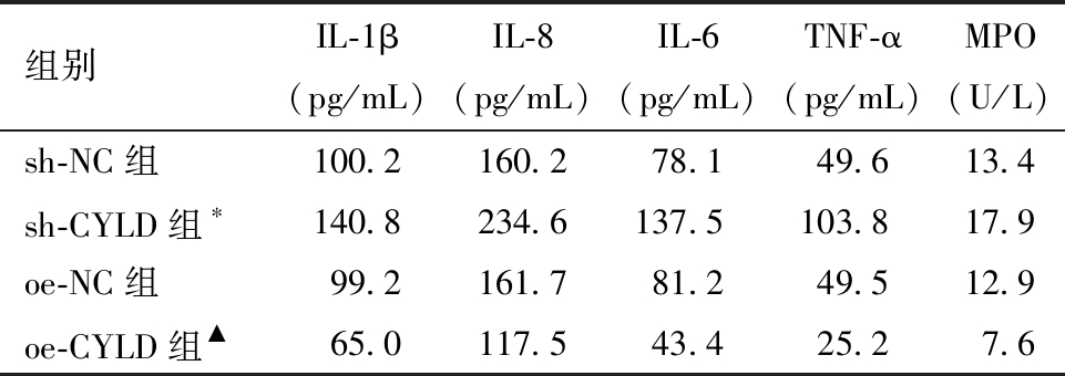 组别IL-1β(pg/mL)IL-8(pg/mL)IL-6(pg/mL)TNF-α(pg/mL)MPO(U/L)sh-NC组100.2160.278.149.613.4sh-CYLD组∗140.8234.6137.5103.817.9oe-NC组99.2161.781.249.512.9oe-CYLD组▲65.0117.543.425.27.6