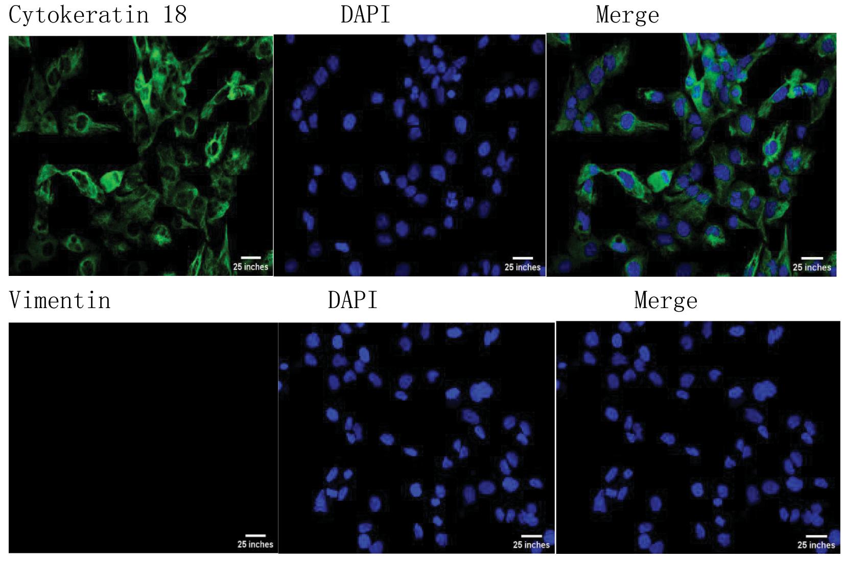 (2)细胞鉴定。取出爬片清洗后用4%多聚甲醛固定30 min并PBS冲洗3次,随后用0.3%曲拉通37 ℃处理30 min后再次PBS冲洗;继而以5%BSA在37℃条件下封闭60 min;冲洗后进行孵育一抗,即滴加适当稀释的一抗(Cytokeratin 18、Vimentin),4℃孵育过夜。冲洗后再进行孵育二抗,即滴加50~100 uL抗- Rabbit、Rabbit -IgG标记荧光抗体,37℃孵育90 min后冲洗;采用DAPI工作液37℃染核10 min后PBS冲洗;最后用缓冲甘油封片。将制备好的玻片避光保存或于荧光显微镜下观察。
