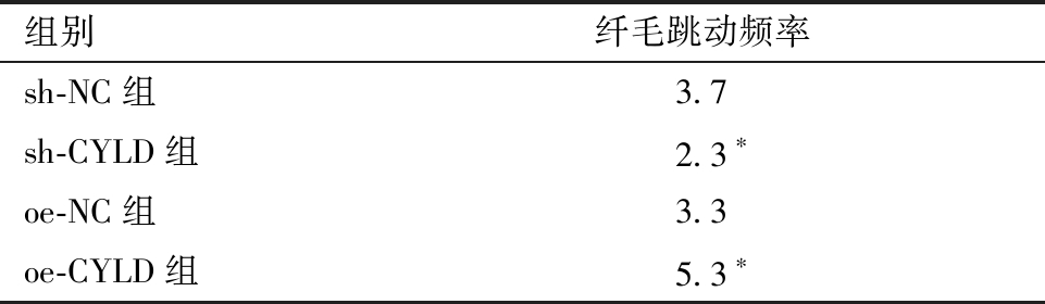 2.各组输卵管炎症上皮细胞CYLD表达对比:图2A所示,sh-NC组与oe-NC组的CYLD表达量相比,差异无统计学意义;sh-CYLD组CYLD的表达量低于sh-NC组,sh-NC组的CYLD表达量明显低于oe-CYLD组,差异均具有统计学意义。如图2B,以内参β-actin为空白对照,sh-NC组与oe-NC组CYLD灰度持平,sh-CYLD组CYLD的灰度 图2 各组CYLD表达量 3.各组输卵管炎症上皮细胞炎症因子的对比:sh-NC组与oe-NC组的各炎症因子水平相比,差异无统计学意义。sh-CYLD组的炎症因子水平显著高于sh-NC高于oe-CYLD组,且各组中oe-CYLD组炎症因子释放最少,以上差异均具有统计学意义。见表1。 4.各组输卵管炎症上皮细胞纤毛跳动频率的对比:sh-NC组与oe-NC组的纤毛跳动频率相比,差异无统计学意义;与sh-NC组、oe-NC组相比,sh-CYLD组的纤毛跳动频率较低;各组中oe-CYLD组的模型细胞跳动频率最高;以上差异均有统计学意义。见表2。 表2 各组纤毛跳动频率比较 与sh-NC组、oe-NC组比较,*P<0.05 组别纤毛跳动频率sh-NC组3.7sh-CYLD组2.3∗oe-NC组3.3oe-CYLD组5.3∗ 5.各组输卵管炎症上皮细胞活性对比:sh-NC组与oe-NC组的细胞活性相比,差异无统计学意义。oe-CYLD组细胞活性最高,sh-CYLD组细胞活性最低,其间oe-NC组的细胞活性优sh-CYLD组,差异具有统计学意义。见图3、表3。 图3 各组细胞活性OD均值 表3 各组细胞活性的比较 与sh-NC组、oe-NC组比较,*P<0.05 组别OD均值sh-NC组1.05sh-CYLD组0.79∗oe-NC组1.07oe-CYLD组1.41∗ 随着现代社会生活方式的改变,输卵管性不孕发病率显著上升且趋于年轻化[11]。研究发现,盆腔炎性疾病(pelvic inflammatory disease,PID)是导致输卵管性不孕的重要原因[12]。输卵管炎是PID中常见的类型,输卵管炎性因素则占输卵管因素不孕的30%,输卵管与周围组织粘连后蠕动及拾卵功能下降,增加受孕难度[13]。每发生一次PID,不孕的概率就逐次增加。可导致不孕的输卵管病变还包括子宫内膜异位症、输卵管先天性发育异常、盆腹部手术、宫腔操作、异位妊娠、长时间放置IUD等[14]。这些疾病会导致输卵管不同部位不同程度的阻塞、输卵管周围炎、输卵管功能异常。因急慢性盆腔炎症致使输卵管发生炎性病理改变,并影响精卵结合的正常生理过程,引发的育龄期妇女不孕症称为输卵管炎性不孕。 输卵管纤毛形态结构和跳动功能的正常有利于受精卵顺利着床与胚胎早期发育,输卵管内壁的纤毛会将卵母细胞推向子宫[15-16]。输卵管急性炎症病理可见输卵管充血增粗、周围与腹膜粘连、黏膜上皮与肌层呈水肿状态和大量中性白细胞浸润。输卵管黏膜上皮呈高柱状,由纤毛细胞、分泌细胞、嵌入细胞、储备细胞组成,故输卵管黏上皮水肿会对纤毛生长与运动产生负面作用。慢性输卵管炎可见输卵管肥大、增粗、蜷曲、与周围组织粘连、伞端形态改变、输卵管各层皆有广泛淋巴细胞与浆细胞浸润、官腔黏膜皱裂变平、上皮低柱状甚至萎缩。输卵管纤毛周围组织肿胀积液,也会干扰纤毛的运动,增加受精卵在输卵管内停留时间,造成不良妊娠结局。输卵管炎症是导致输卵管性不孕的重要原因,病原体侵入女性生殖器及附件发生炎症反应,炎性分泌物渗出刺激输卵管内细胞增生,形成纤维粘连组织,导致输卵管炎性阻塞[17]。病原体感染、手术损伤、子宫内膜异位症、免疫损伤、输卵管结核等因素引发盆腔炎,致使输卵管发生粘连,影响输卵管管腔通畅度,不利于精卵结合与着床,进而引发输卵管炎性不孕[1]。输卵管的内层是黏膜层,黏膜层主要由纤毛细胞与分泌细胞构成,炎症发生时纤毛细胞形态功能发生异常会降低输卵管上皮细胞活性,影响输卵管对配子的运输,导致输卵管炎性不孕。洪金妮等[18]发现用脂多糖(LPS)干预大鼠输卵管上皮细胞24 h、48 h后细胞活性分别为58%、37%,证明大量长期的炎症刺激会使大鼠输卵管上皮细胞活性降低。研究证实,CYLD具有去泛素化活性,其可以去泛素化负向调节NF-kB炎症信号通路[19]。Zhang等[20]研究发现CYLD是抑制NF-kB炎症通路激活的必需调节剂,认为CYLD可能参与类风湿性关节炎成纤维细胞样滑膜细胞的促炎作用和过度增殖。CYLD可能成为应激诱导的肝脏炎症和损伤的治疗靶点[21]。CYLD与14-3-3γ/ε/η三种亚型存在相互作用,参与炎症应答等众多生物学过程[22]。但目前缺乏相关实验研究证明CYLD与输卵管炎症等女性生殖道炎症存在明确关系。此外,纤毛的发生与运动也与CYLD有密不可分的关系,CYLD使Cep70去泛素化并与γ-微管蛋白相互作用并定位于中心体,抑制促进微管蛋白乙酰化,影响纤毛的发生与运动;CYLD在多个器官的纤毛生成与运动中发挥关键作用,CYLD基因敲除小鼠存在多器官发育缺陷,如皮肤与气管发育异常、肺成熟受损、睾丸发育不良导致雄性不孕[23]。CYLD与CAP-Gly结构域相互作用,发挥其泛素化功能促进纤毛形成[24]。CYLD参与炎症反应与纤毛生长运动,故本研究推测CYLD间接影响上皮细胞活性。输卵管炎症水平和输卵管内纤毛运动与输卵管炎性不孕密切相关,CYLD可能参与调控输卵管炎症和输卵管纤毛运动,影响输卵管上皮细胞活性,进而在一定程度上改善妊娠结局。 本研究采用免疫荧光(immunofluorescence,IF)鉴定大鼠输卵管上皮细胞,分别设立阴性对照组、过表达对照组、阴性实验组、过表达实验组验证CYLD与输卵管炎症和纤毛的关系,观察各组输卵管炎症上皮细胞中CYLD表达量、炎症因子含量,纤毛跳动频率、细胞活性,发现各实验中sh-NC组与oe-NC组差异