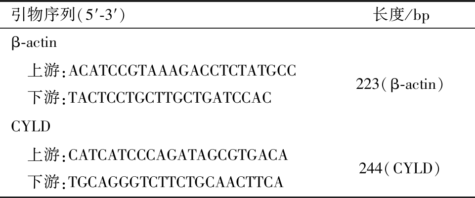引物序列(5′-3′)长度/bpβ-actin 上游:ACATCCGTAAAGACCTCTATGCC 下游:TACTCCTGCTTGCTGATCCAC223(β-actin)CYLD 上游:CATCATCCCAGATAGCGTGACA 下游:TGCAGGGTCTTCTGCAACTTCA244(CYLD)