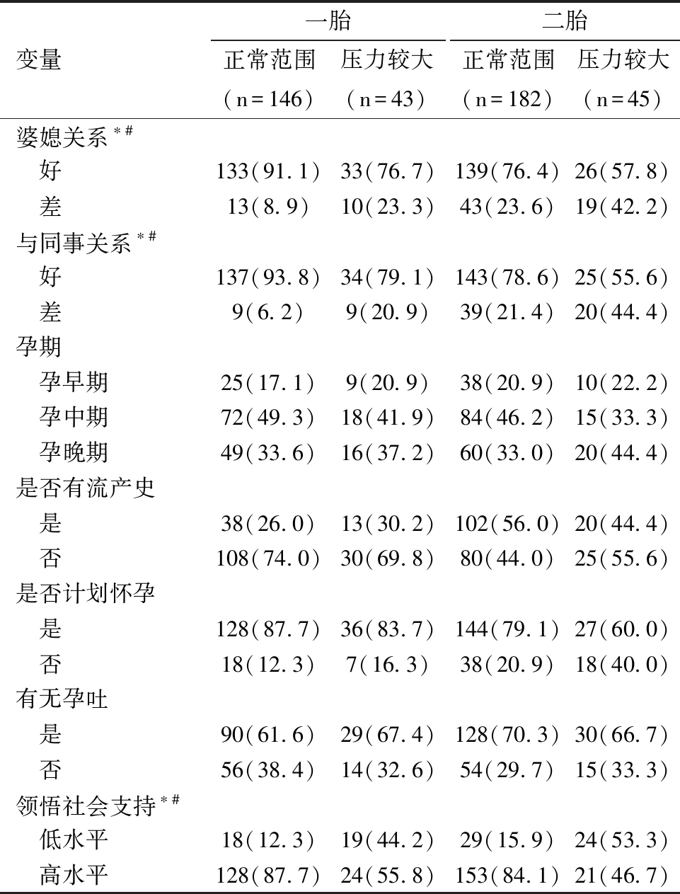 变量一胎正常范围(n=146)压力较大(n=43)二胎正常范围(n=182)压力较大(n=45)婆媳关系∗# 好133(91.1)33(76.7)139(76.4)26(57.8) 差13(8.9)10(23.3)43(23.6)19(42.2)与同事关系∗# 好137(93.8)34(79.1)143(78.6)25(55.6) 差9(6.2)9(20.9)39(21.4)20(44.4)孕期 孕早期25(17.1)9(20.9)38(20.9)10(22.2) 孕中期72(49.3)18(41.9)84(46.2)15(33.3) 孕晚期49(33.6)16(37.2)60(33.0)20(44.4)是否有流产史 是38(26.0)13(30.2)102(56.0)20(44.4) 否108(74.0)30(69.8)80(44.0)25(55.6)是否计划怀孕 是128(87.7)36(83.7)144(79.1)27(60.0) 否18(12.3)7(16.3)38(20.9)18(40.0)有无孕吐 是90(61.6)29(67.4)128(70.3)30(66.7) 否56(38.4)14(32.6)54(29.7)15(33.3)领悟社会支持∗# 低水平18(12.3)19(44.2)29(15.9)24(53.3) 高水平128(87.7)24(55.8)153(84.1)21(46.7)