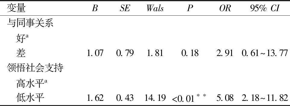 变量BSEWalsPOR95% CI与同事关系 好a 差1.070.791.810.182.910.61~13.77领悟社会支持 高水平a 低水平1.620.4314.19<0.01∗∗5.082.18~11.82