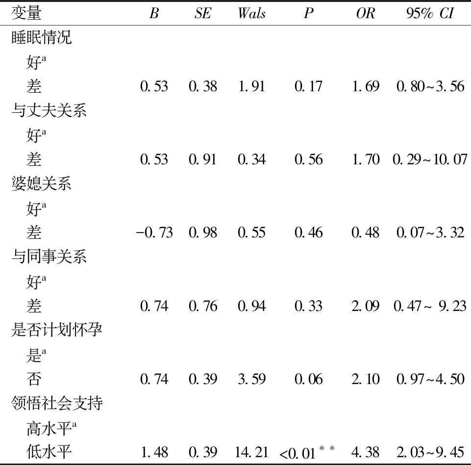 变量BSEWalsPOR95% CI睡眠情况 好a 差0.530.381.910.171.690.80~3.56与丈夫关系 好a 差0.530.910.340.561.700.29~10.07婆媳关系 好a 差-0.730.980.550.460.480.07~3.32与同事关系 好a 差0.740.760.940.332.090.47~ 9.23是否计划怀孕 是a 否0.740.393.590.062.100.97~4.50领悟社会支持 高水平a 低水平1.480.3914.21<0.01∗∗4.382.03~9.45