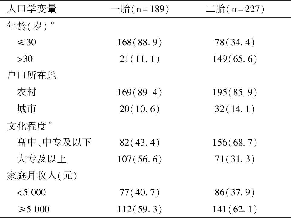 人口学变量一胎(n=189)二胎(n=227)年龄(岁)∗ ≤30168(88.9)78(34.4) >3021(11.1)149(65.6)户口所在地 农村169(89.4)195(85.9) 城市20(10.6)32(14.1)文化程度∗ 高中、中专及以下82(43.4)156(68.7) 大专及以上107(56.6)71(31.3)家庭月收入(元) <5 00077(40.7)86(37.9) ≥5 000112(59.3)141(62.1)