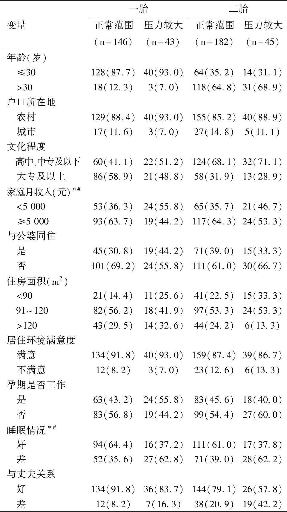 变量一胎正常范围(n=146)压力较大(n=43)二胎正常范围(n=182)压力较大(n=45)年龄(岁) ≤30128(87.7)40(93.0)64(35.2)14(31.1) >3018(12.3)3(7.0)118(64.8)31(68.9)户口所在地 农村129(88.4)40(93.0)155(85.2)40(88.9) 城市17(11.6)3(7.0)27(14.8)5(11.1)文化程度 高中、中专及以下60(41.1)22(51.2)124(68.1)32(71.1) 大专及以上86(58.9)21(48.8)58(31.9)13(28.9)家庭月收入(元)∗# <5 00053(36.3)24(55.8)65(35.7)21(46.7) ≥5 00093(63.7)19(44.2)117(64.3)24(53.3)与公婆同住 是45(30.8)19(44.2)71(39.0)15(33.3) 否101(69.2)24(55.8)111(61.0)30(66.7)住房面积(m2) <9021(14.4)11(25.6)41(22.5)15(33.3) 91~12082(56.2)18(41.9)97(53.3)24(53.3) >12043(29.5)14(32.6)44(24.2)6(13.3)居住环境满意度 满意134(91.8)40(93.0)159(87.4)39(86.7) 不满意12(8.2)3(7.0)23(12.6)6(13.3)孕期是否工作 是63(43.2)24(55.8)83(45.6)18(40.0) 否83(56.8)19(44.2)99(54.4)27(60.0)睡眠情况∗# 好94(64.4)16(37.2)111(61.0)17(37.8) 差52(35.6)27(62.8)71(39.0)28(62.2)与丈夫关系 好134(91.8)36(83.7)144(79.1)26(57.8) 差12(8.2)7(16.3)38(20.9)19(42.2)