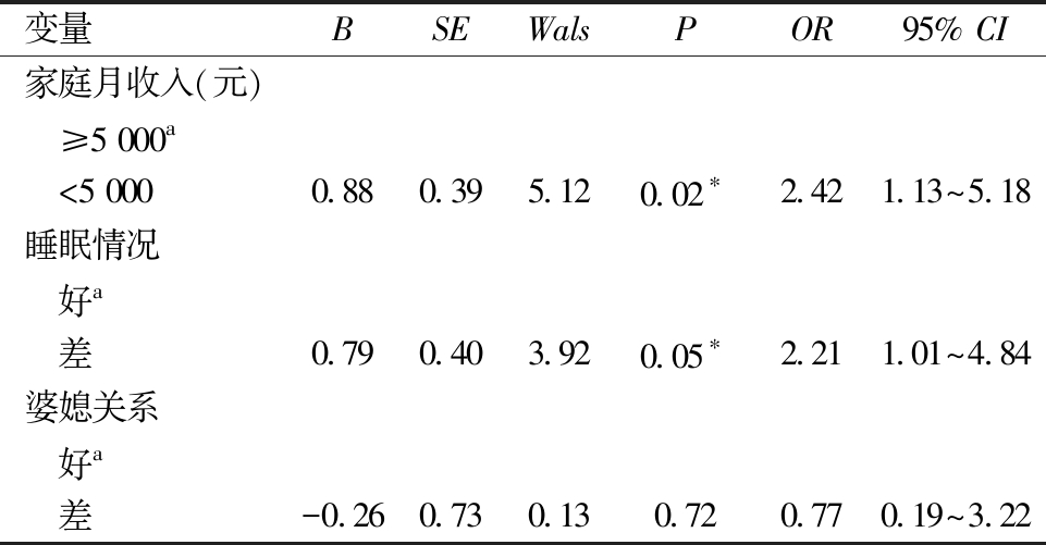 变量BSEWalsPOR95% CI家庭月收入(元) ≥5 000a <5 0000.880.395.120.02∗2.421.13~5.18睡眠情况 好a 差0.790.403.920.05∗2.211.01~4.84婆媳关系 好a 差-0.260.730.130.720.770.19~3.22